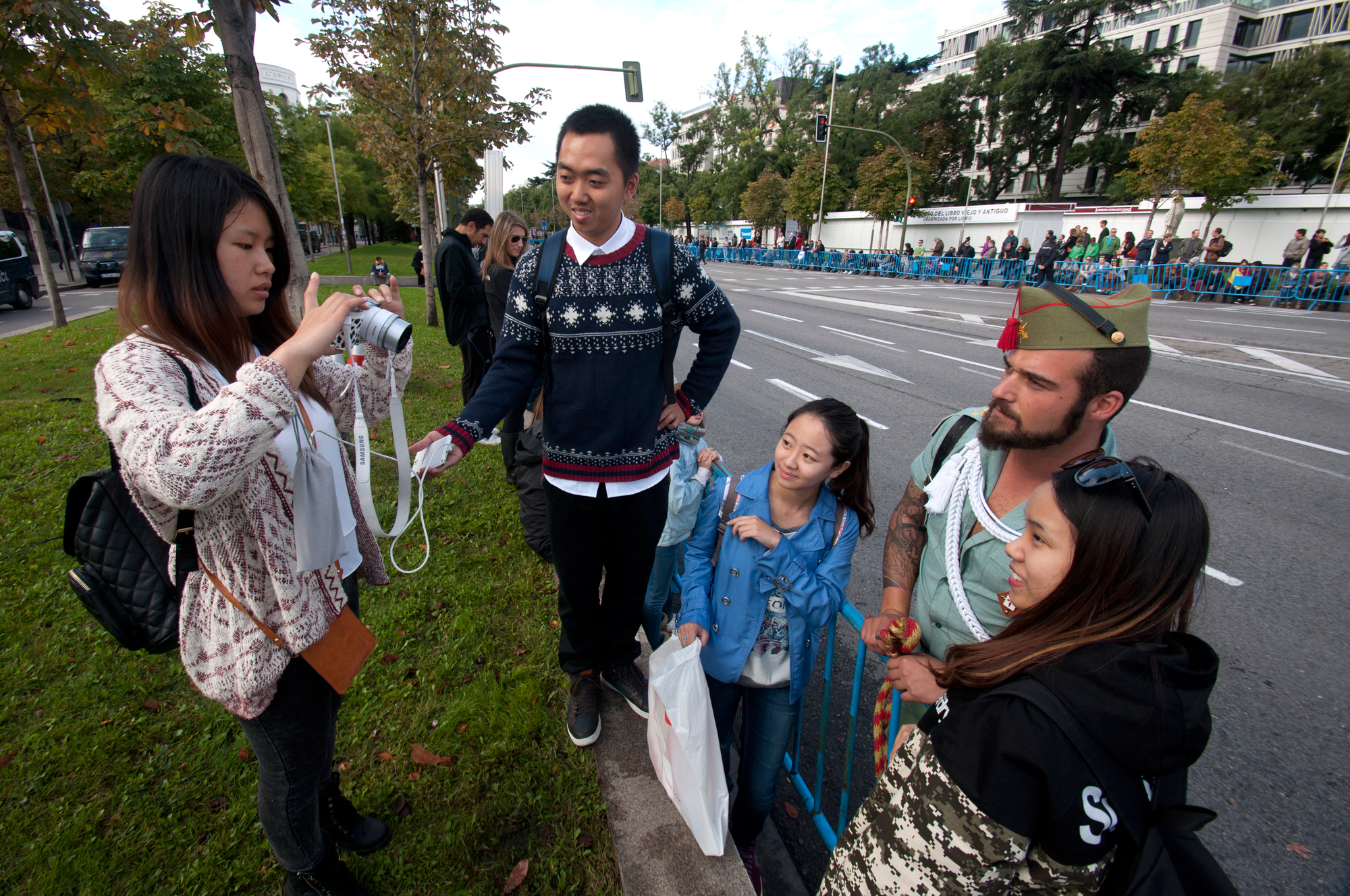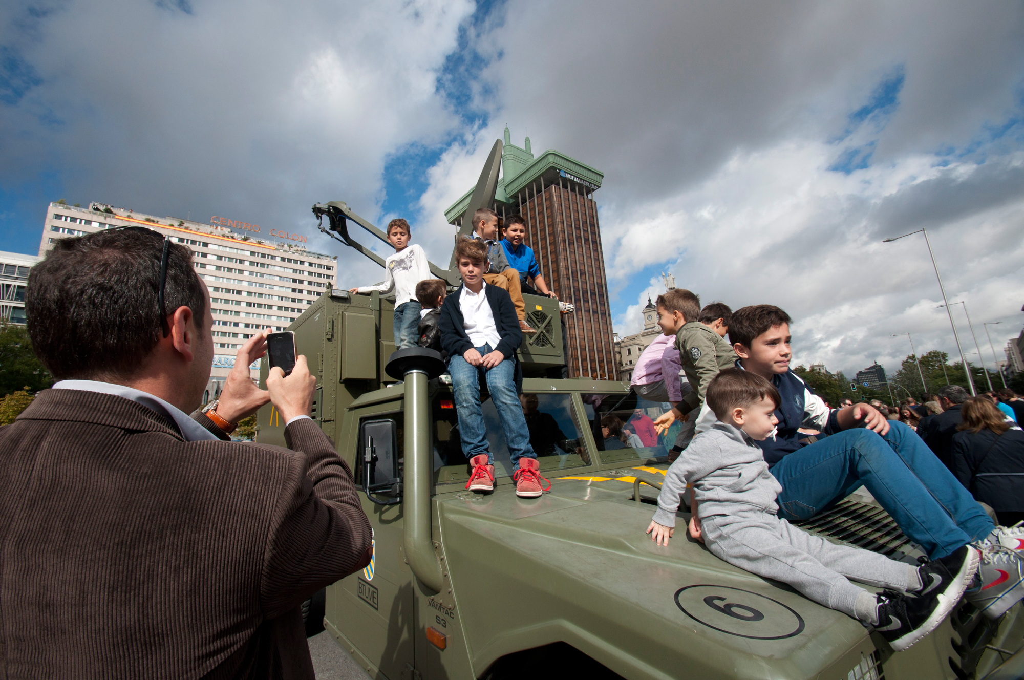 Miles de personas han acudido al centro de Madrid para disfrutar del desfile de las Fuerzas Armadas en el día de la Hispanidad. Un ambiente cargado de diversión y festividad.