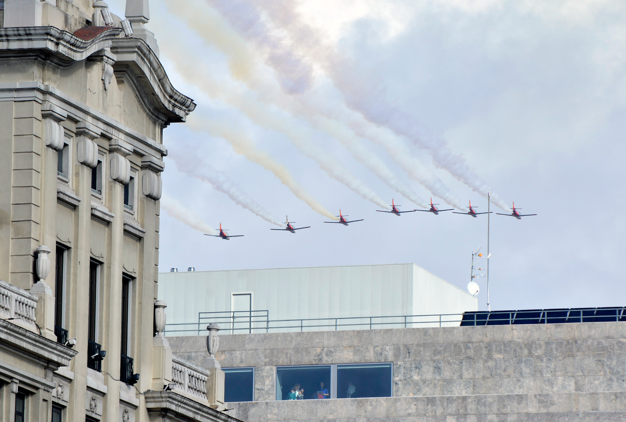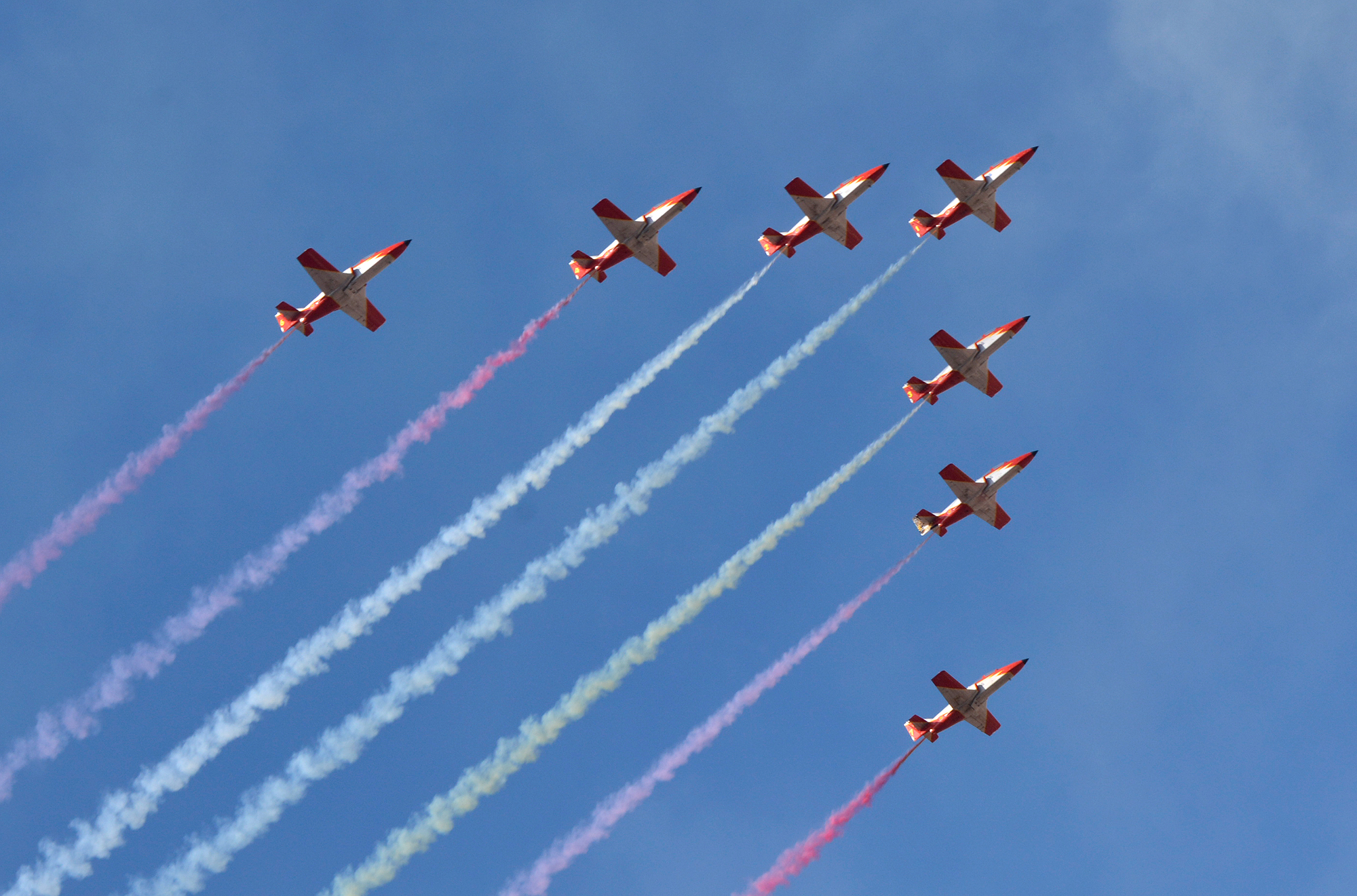 La Patrulla Águila, como siempre espectacular despliegue de la bandera de España en el aire, uno de puntos más esperados y queridos del desfile.