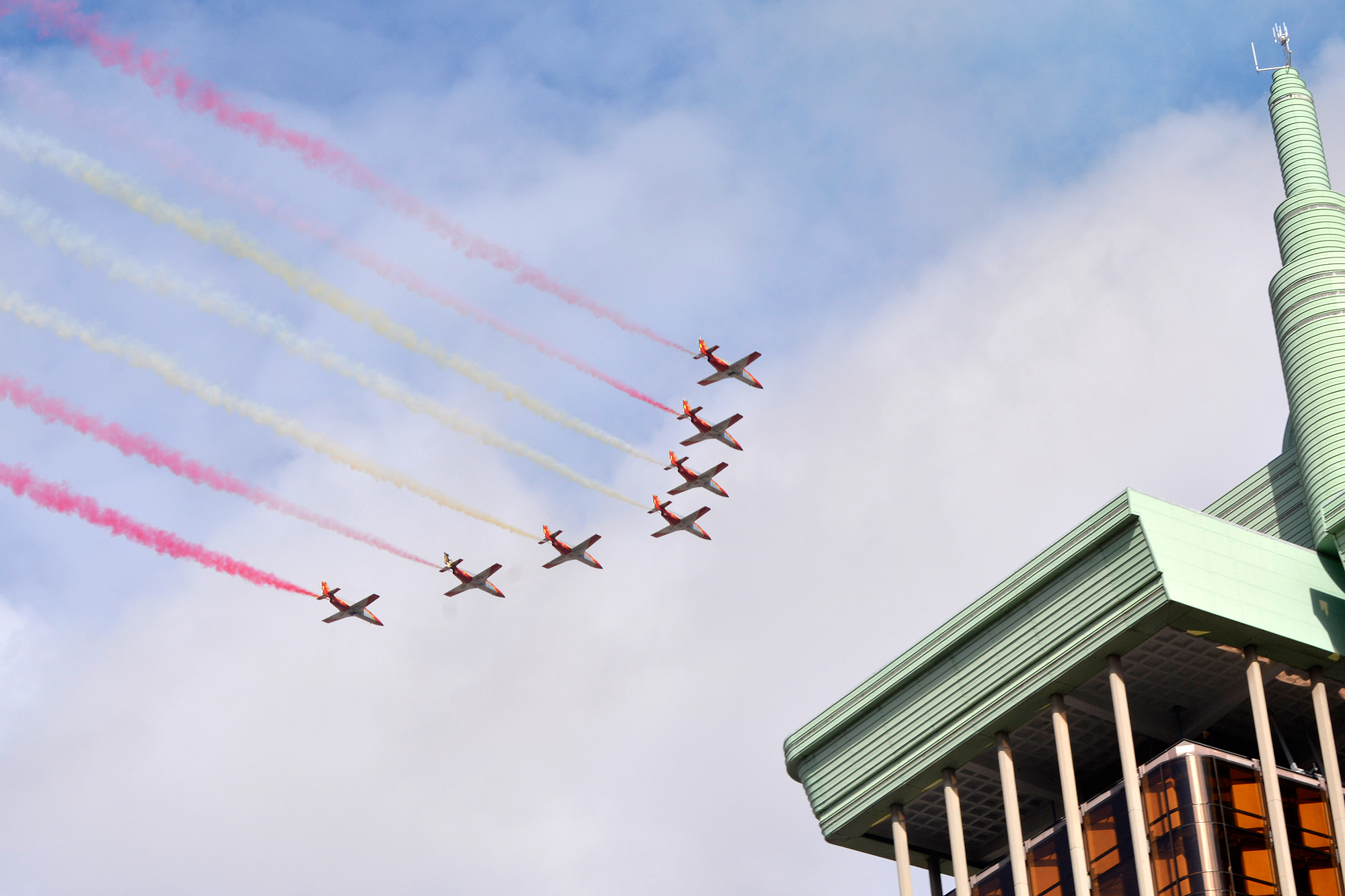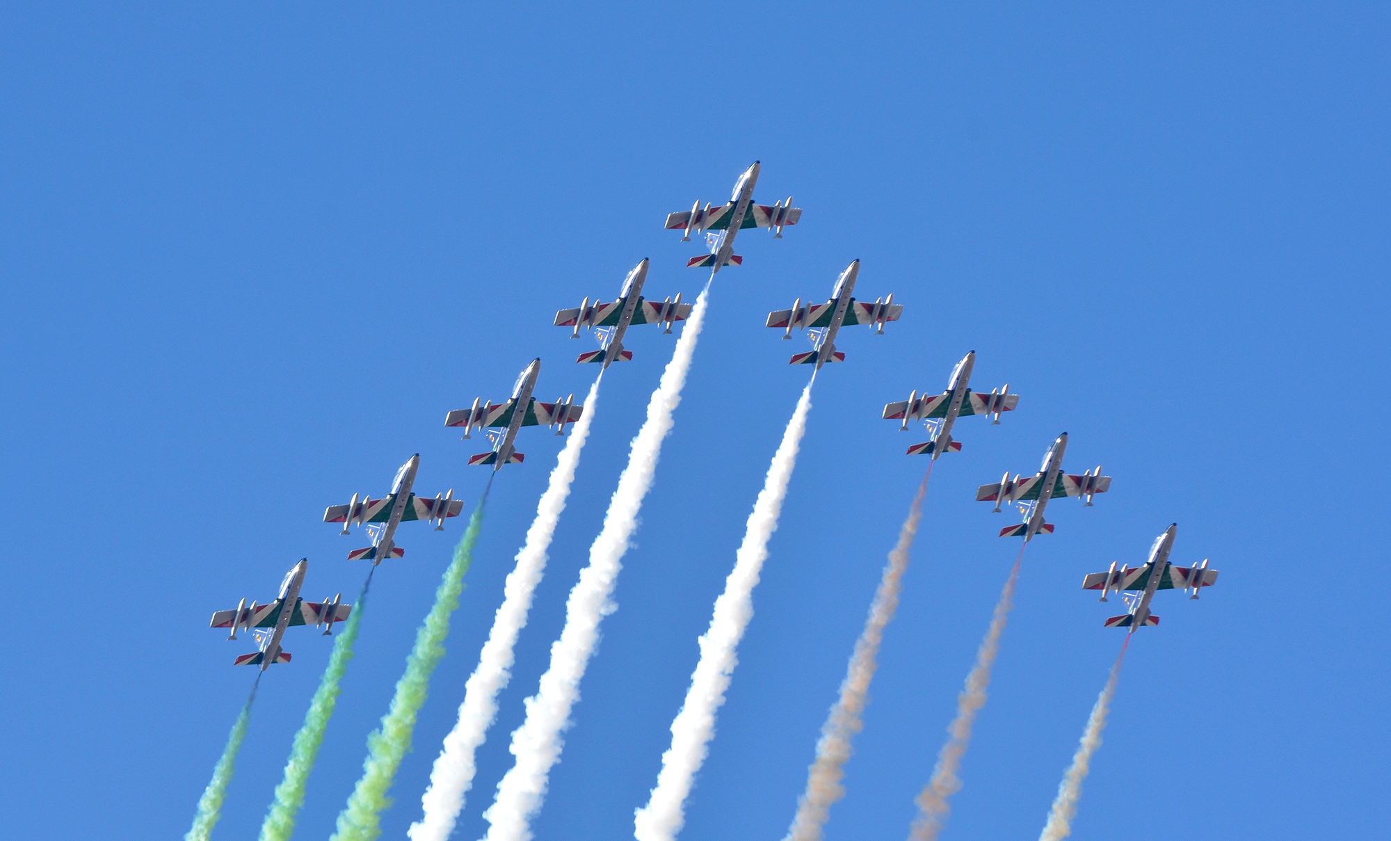 Patrulla acrobática Frecce Tricolori de la Fuerza Aérea italia, conformada por nueve aviones Aermacchi MB-339.