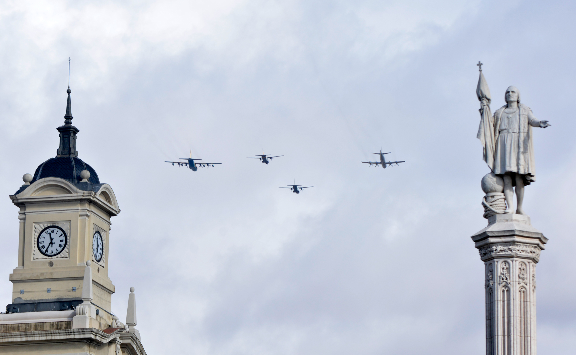 La Patrulla Águila a su paso por encima de la Torre de Colón, en Madrid.