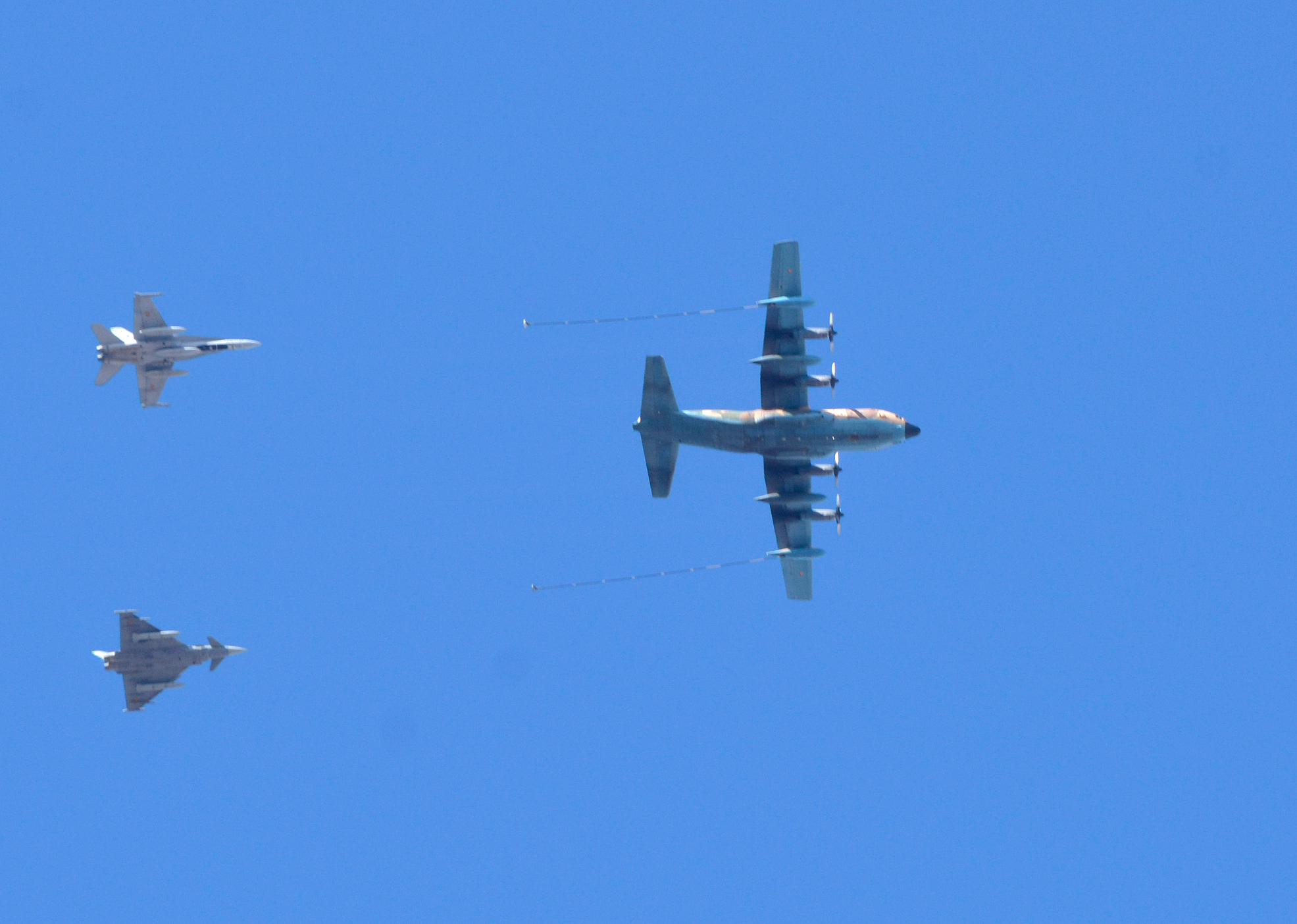 Un boeing 707 de reabastecimiento en vuelo simula un traspado de combustible a un caza F-18 Hornet y un caza Eurofighter Thypoon.