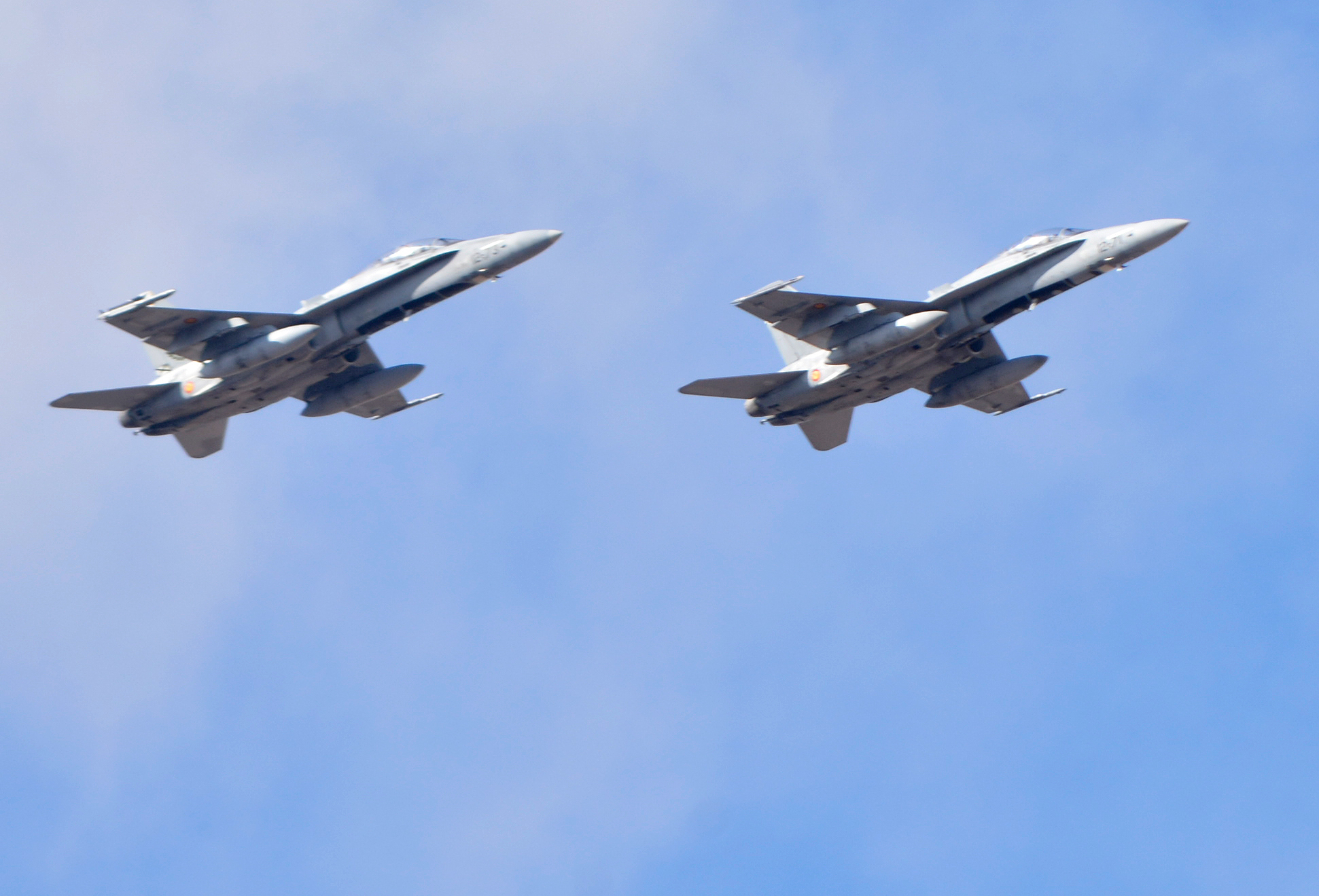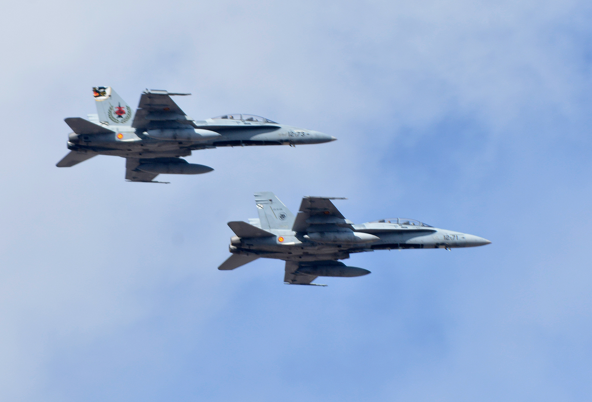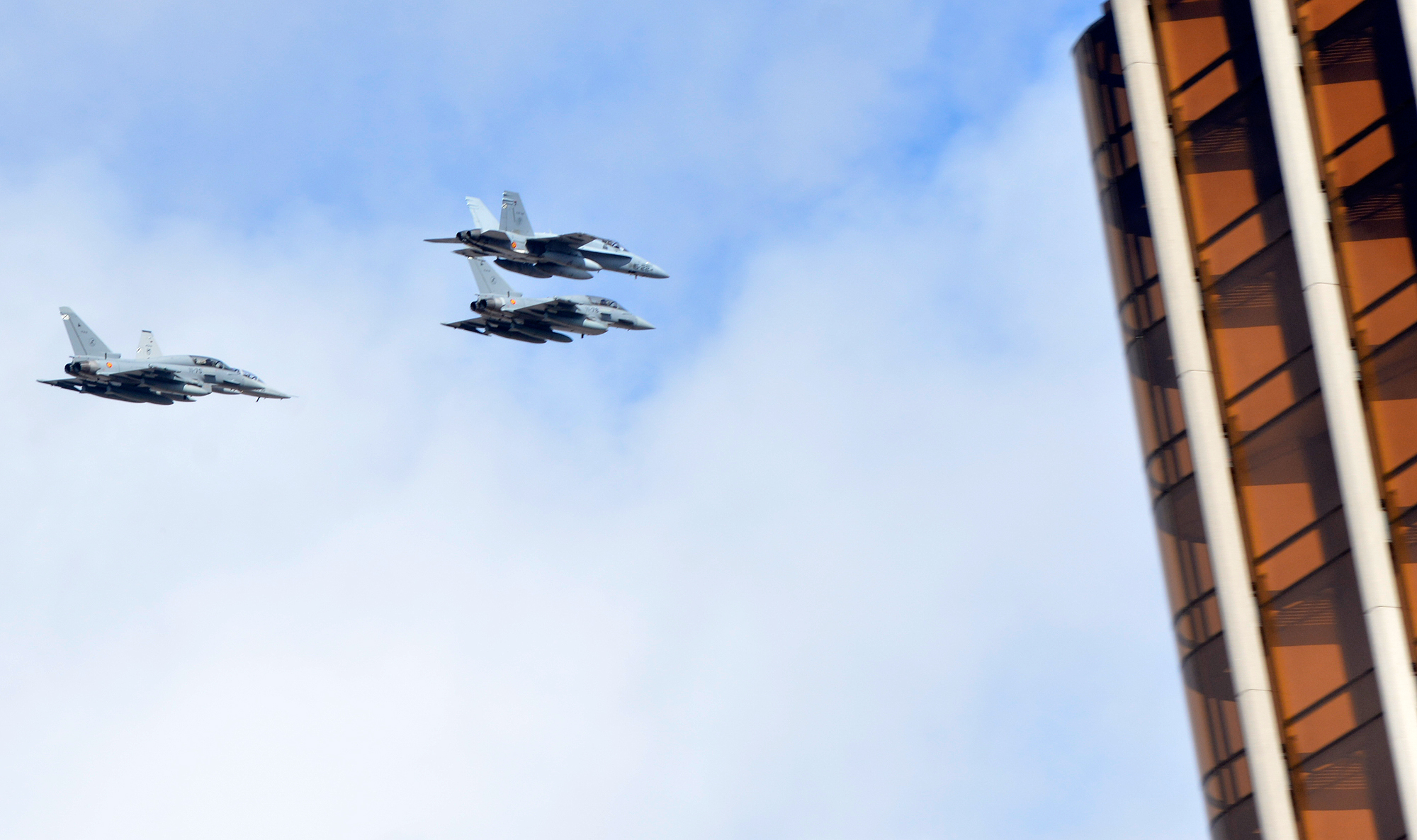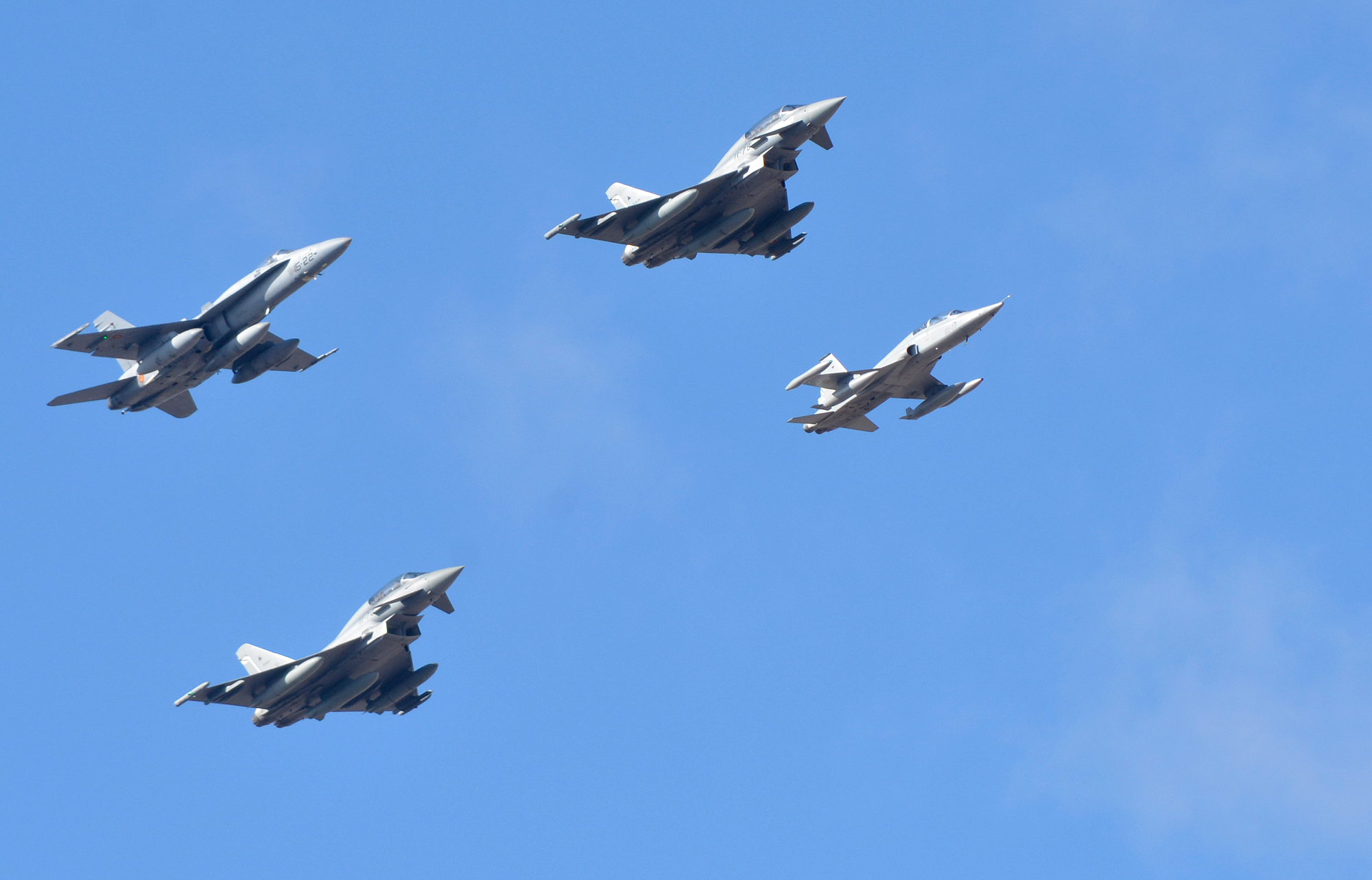 Un caza F-18 Hornet, dos cazas Eurofighter Thypoon y un caza Northrop F-5 del Ejército del Aire.