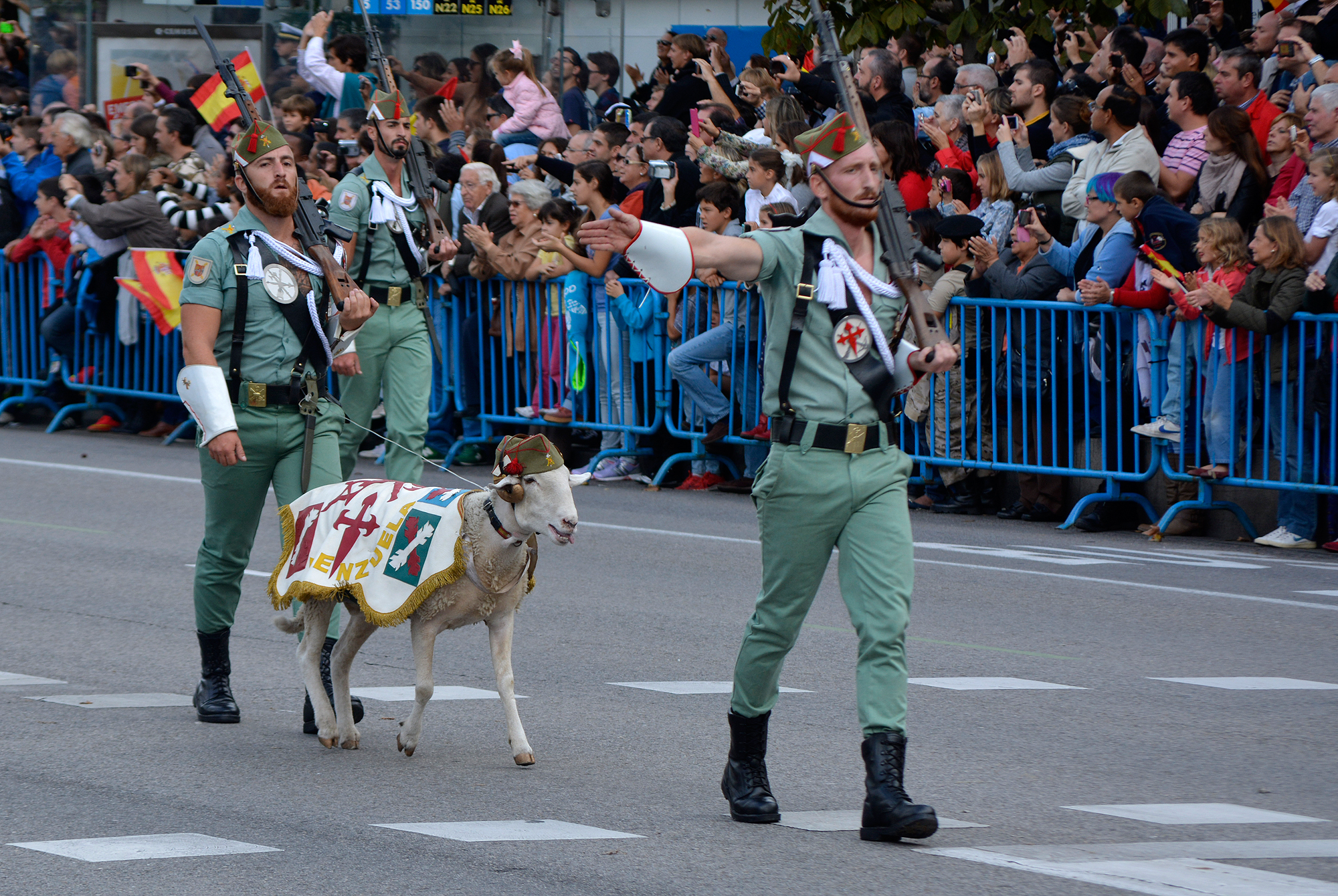 La cabra de la Legión, acompañada por tres soldados legionarios durante el desfile de las Fuerzas Armadas del 2014.