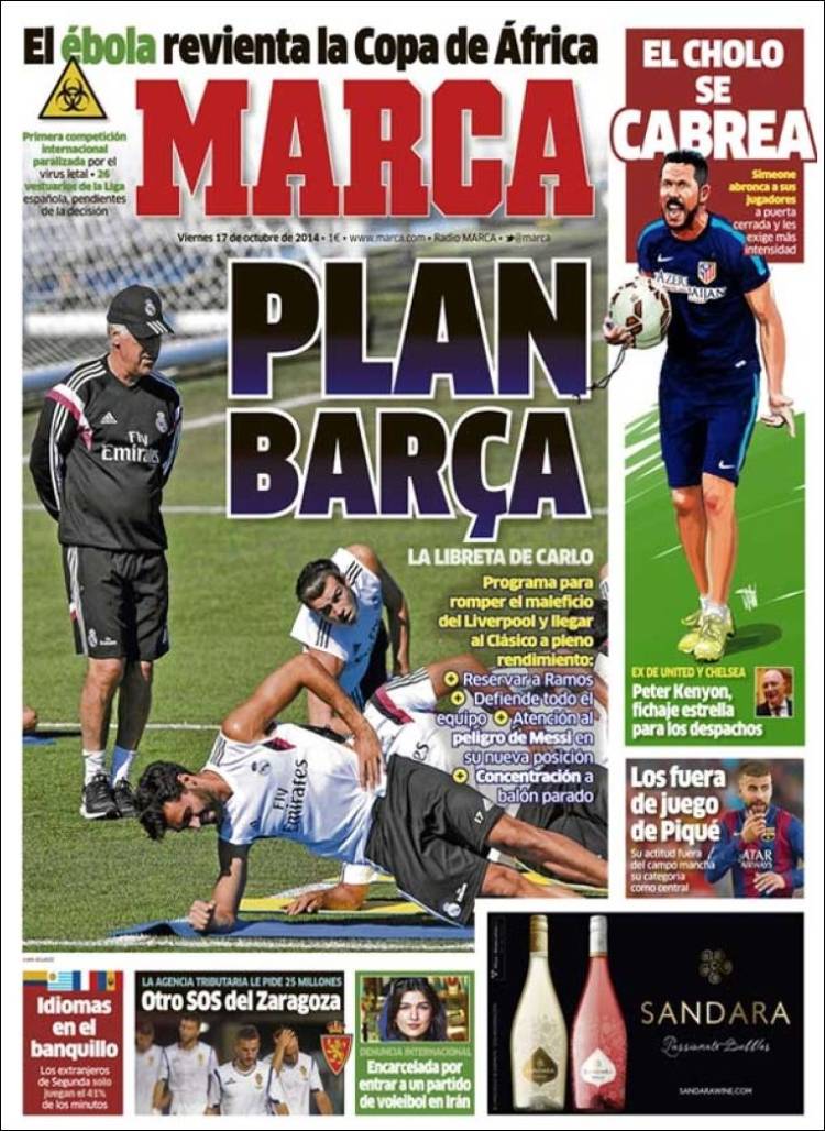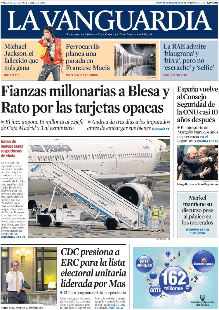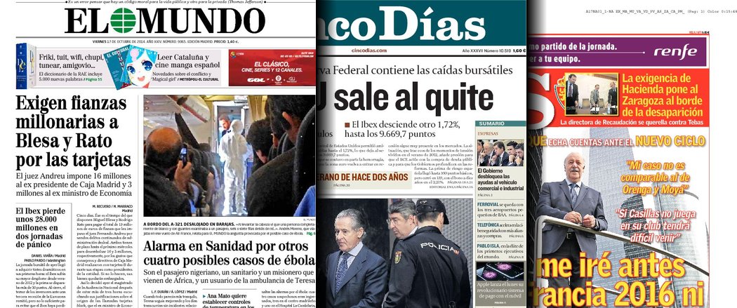 Portadas de los diarios El Mundo, El País, ABC, La Razón, La Vanguardia, El Periódico, Cinco Días, El Economista, Expansión, Marca, As, Mundo Deportivo y Sport.
