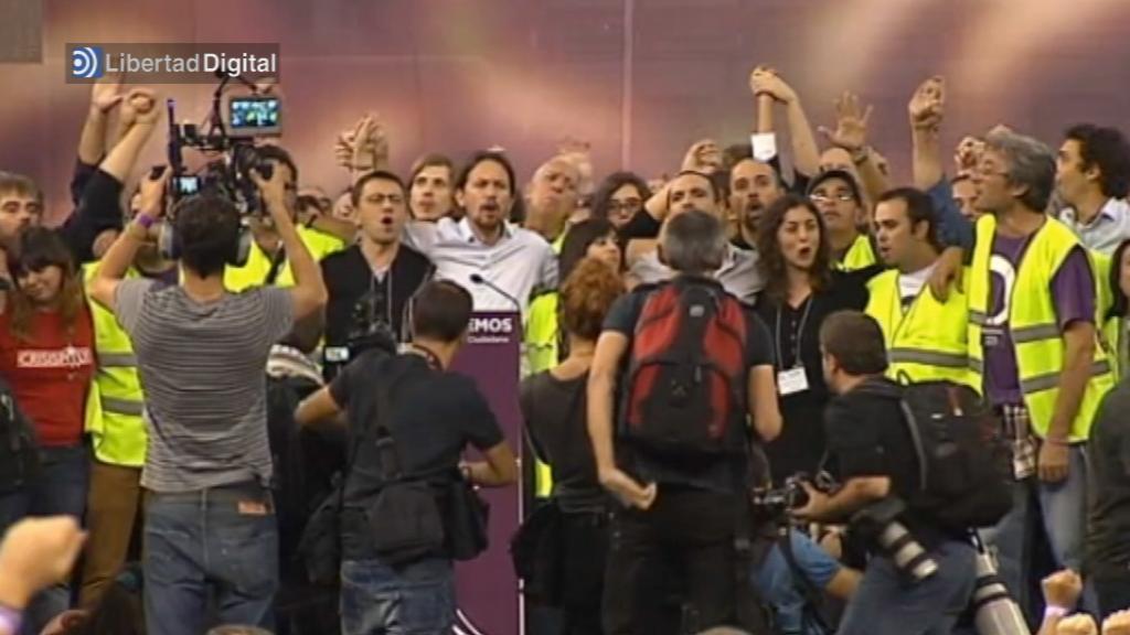La asamblea de Podemos terminó con toda la cúpula subida al escenario y cantando la canción 'L'estaca' de Lluis Llach.