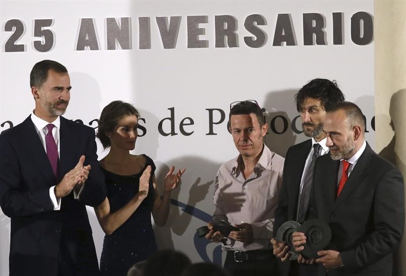Los periodistas Marc Marginedas (d), Ricardo García Vilanova (2d) y Javier Espinosa (3d) recibieron el galardón "Reporteros del mundo".