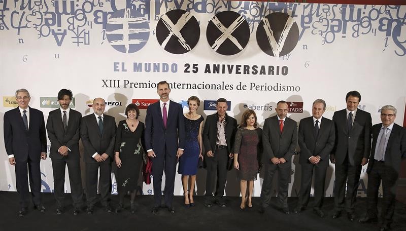 La foto con los premiados, que posaron con los Reyes, la vicepresidenta del Gobierno y el director de El Mundo.