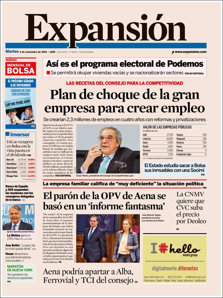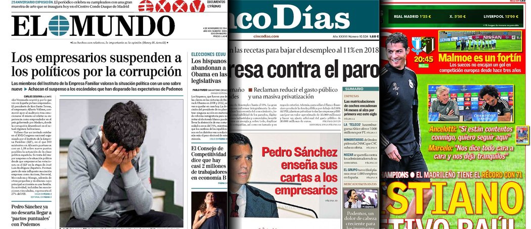Portadas de los diarios El Mundo, El País, ABC, La Razón, La Vanguardia, El Periódico, Cinco Días, El Economista, Expansión, Marca, As, Mundo Deportivo y Sport.