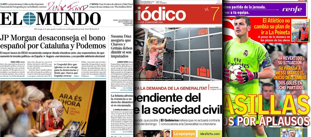 Portadas de los diarios El Mundo, El País, ABC, La Razón, La Vanguardia, El Periódico, Cinco Días, El Economista, Expansión, Marca, As, Mundo Deportivo y Sport.