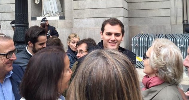 Albert Rivera, presidente de Ciudadanos, saluda a varios de los asistentes al acto cívico convocado por Libres e Iguales en Barcelona, en la plaza de San Jaime