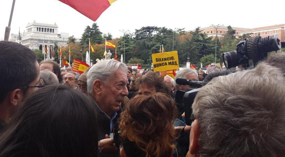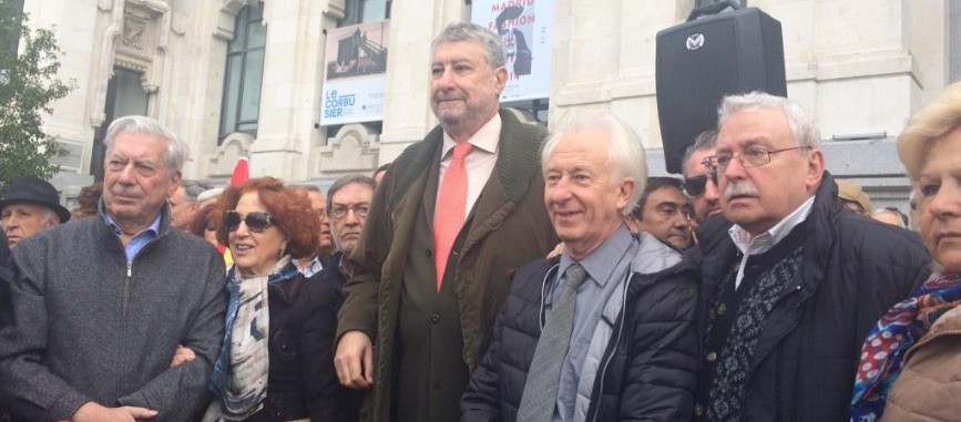 Albert Boadella, Mario Vargas Llosa y Ángeles Pedraza en la plaza de Cibeles de Madrid