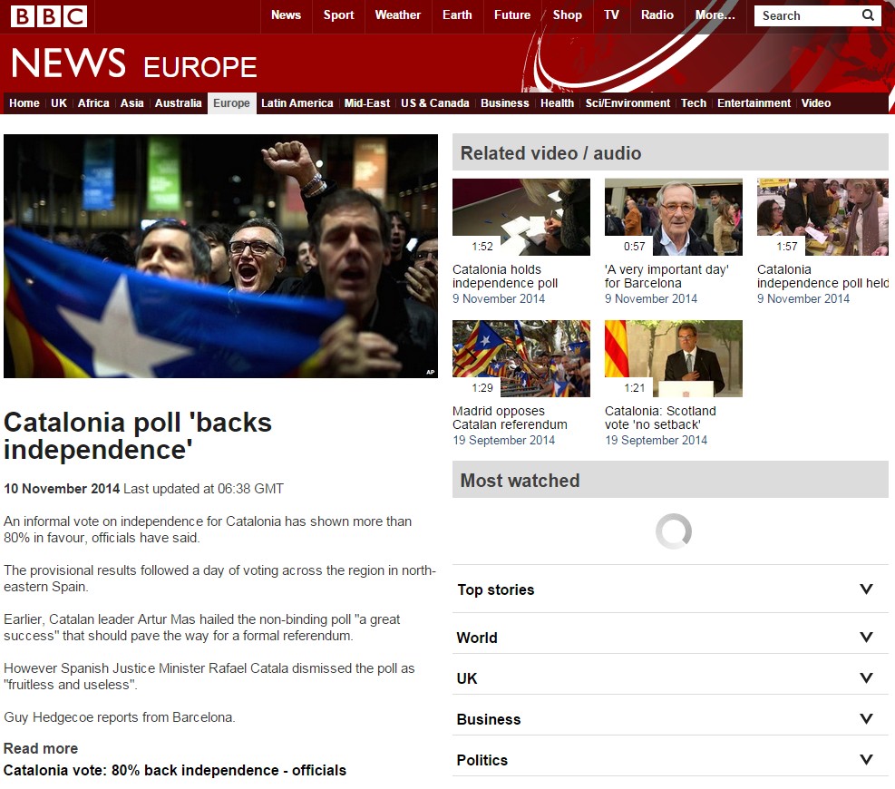 La británica BBC titula "Catalonia poll 'backs independence'": La encuesta en Cataluña "respalda la inependencia", aunque recuerda que ha sido una consulta "informal".