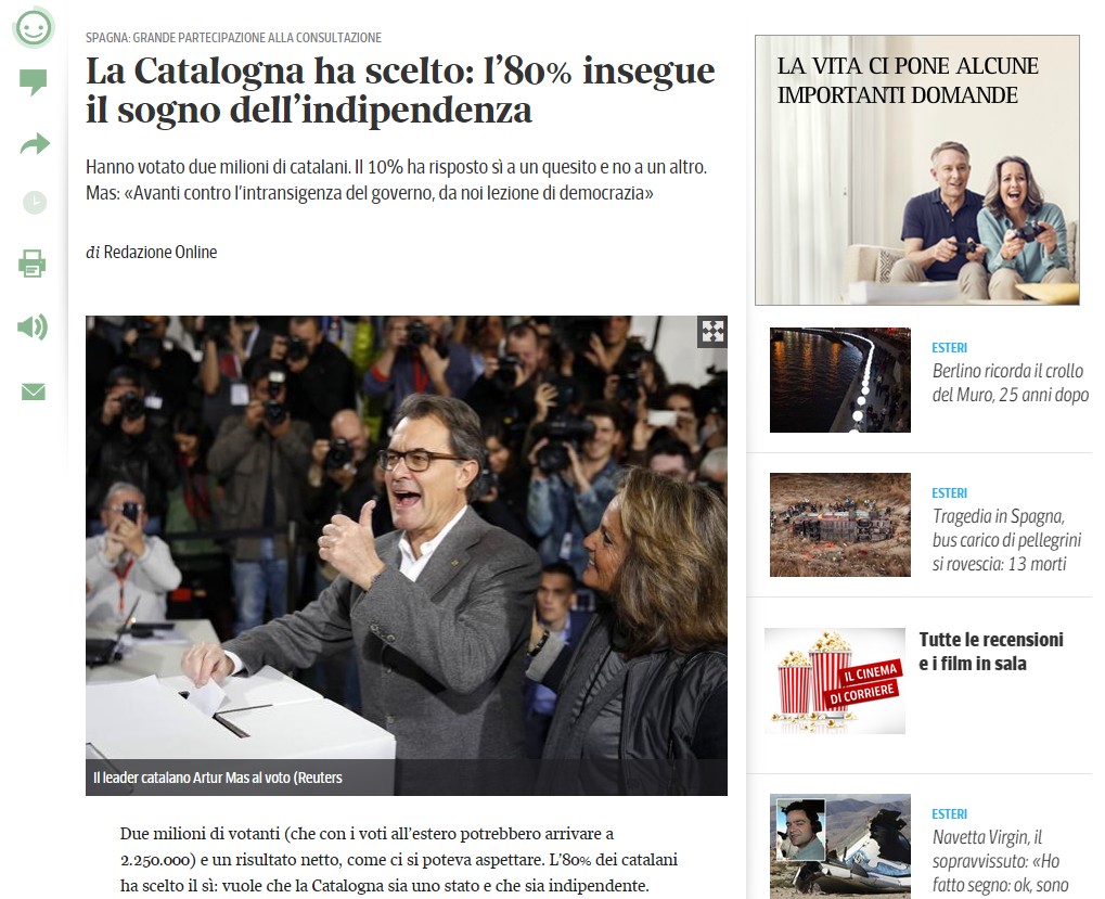 En italia Il Corriere della sera titula: "La Catalogna ha scelto: l’80% insegue il sogno dell’indipendenza", Cataluña ha elegido: el 80% persigue el sueño de la independencia.