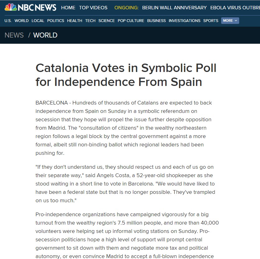 En la NBC: "Catalonia Votes in Symbolic Poll for Independence From Spain", Cataluña vota en una consulta simbólica por la independencia de España.