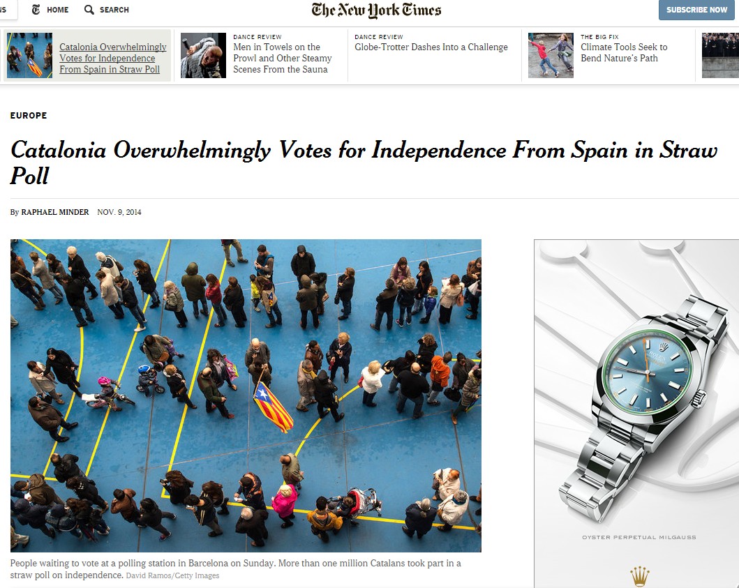 The New York Times titula "Catalonia Overwhelmingly Votes for Independence From Spain in Straw Poll", Cataluña vota de forma abrumadura por la independencia de España en una encuesta de paja, recordando la ilegalidad del proceso y el desafío del gobierno catalán a la justicia española.