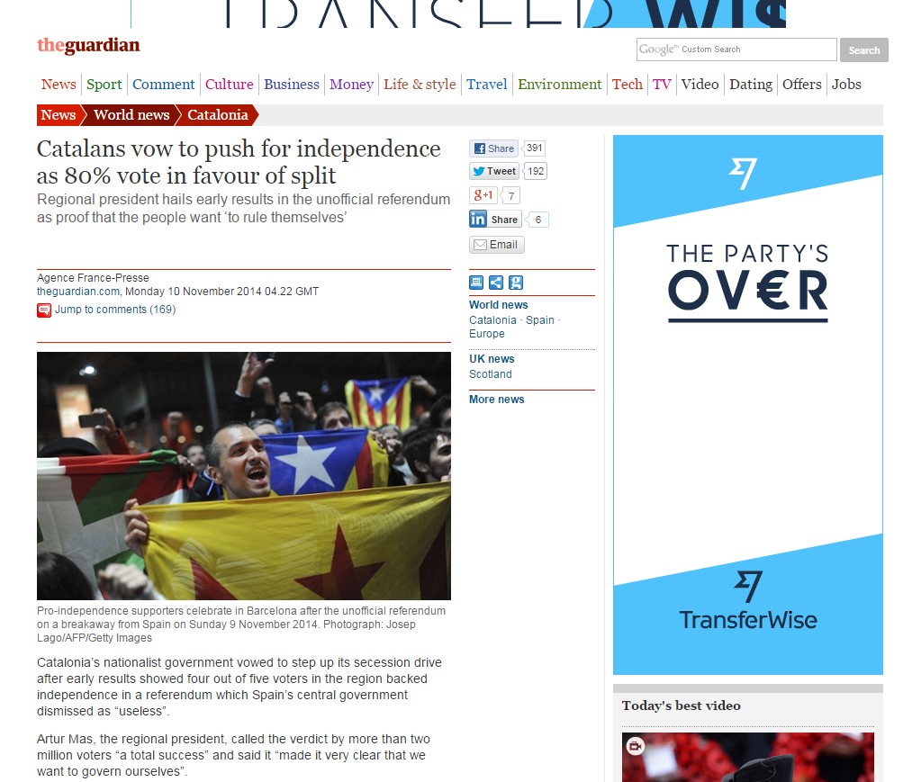 The Guardian afirma en su edición digital: "Catalans vow to push for independence as 80% vote in favour of split", los catalanes insisten en la independencia con el 80% del voto a favor de la división, y destacan que es una consulta "no oficial".