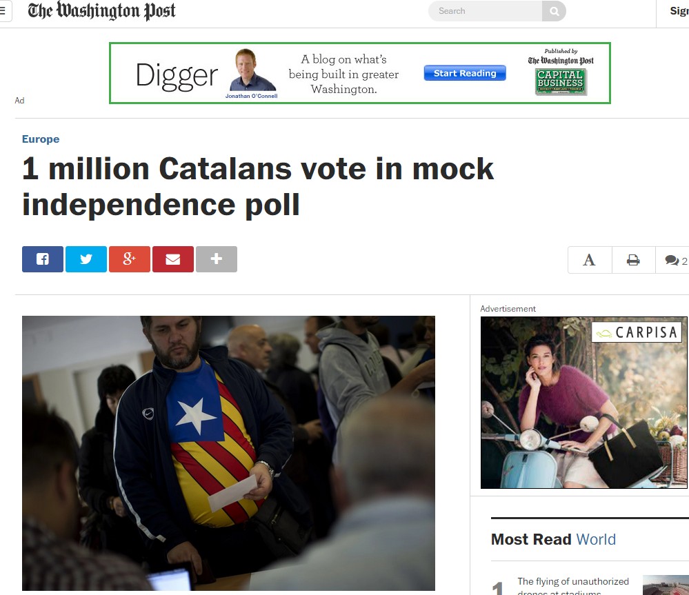 Por su parte, al otro lado del charco, The Washington Post titula "1 million Catalans vote in mock independence poll", un millón de catalanes votan en un simulacro de encuesta de la independencia.