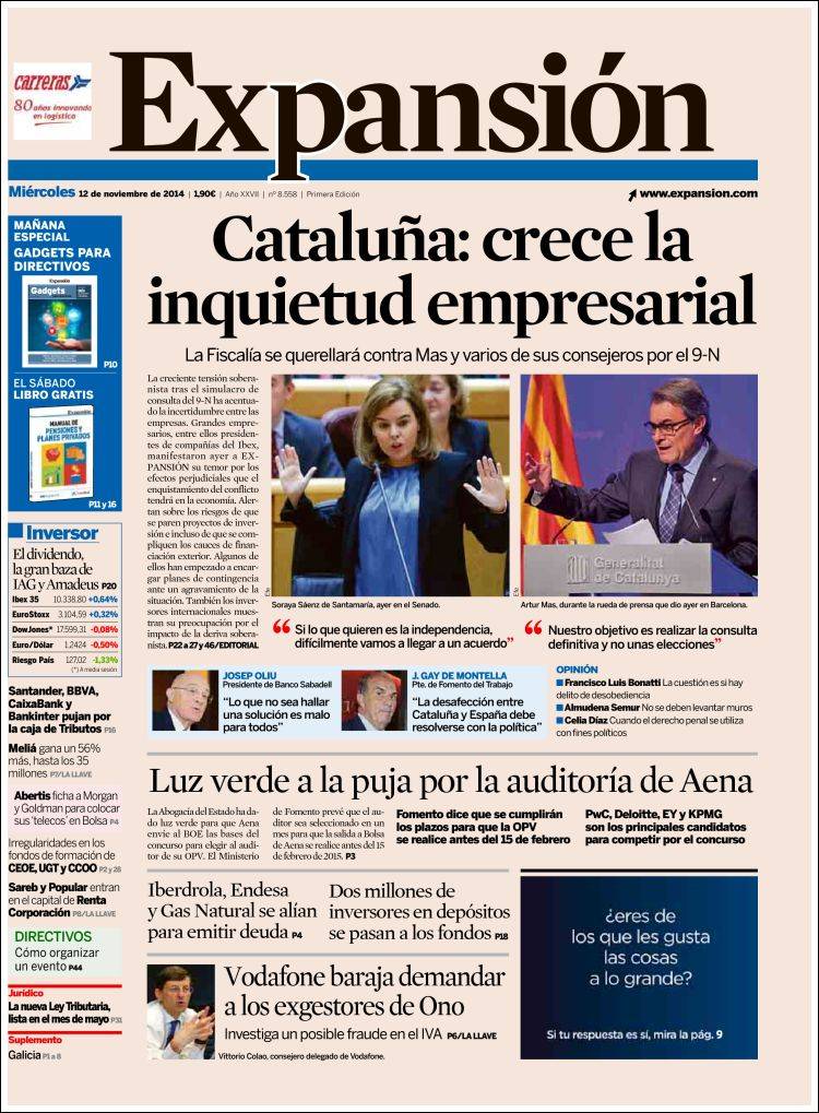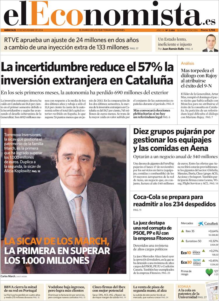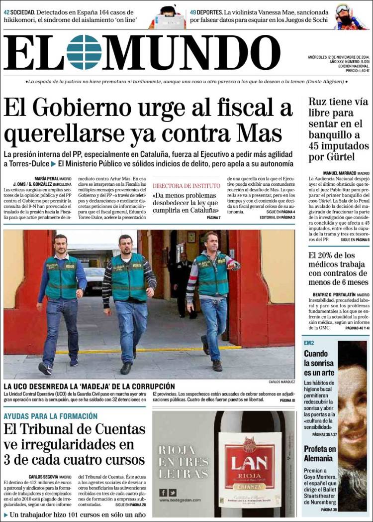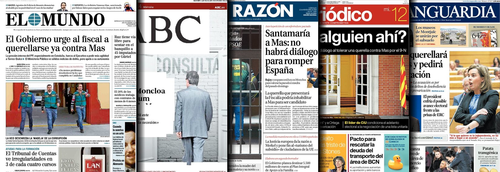 Portadas de los diarios El Mundo, El País, ABC, La Razón, La Vanguardia, El Periódico, Cinco Días, El Economista, Expansión, Marca, As, Mundo Deportivo y Sport.