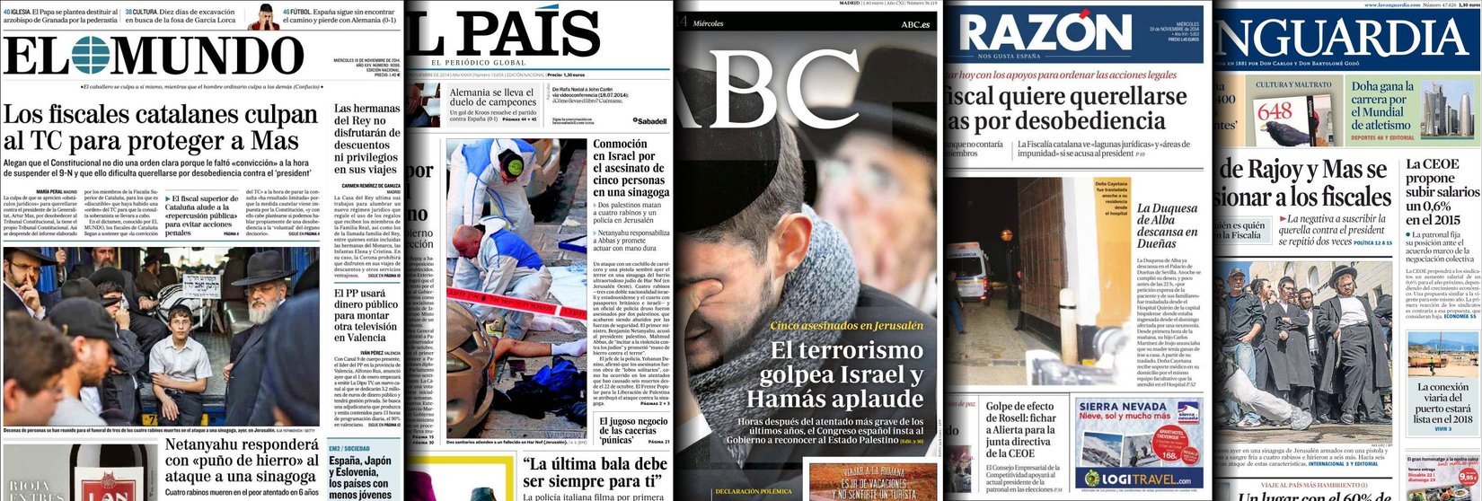 Portadas de los diarios El Mundo, El País, ABC, La Razón, La Vanguardia, El Periódico, Cinco Días, El Economista, Expansión, Marca, As, Mundo Deportivo y Sport.