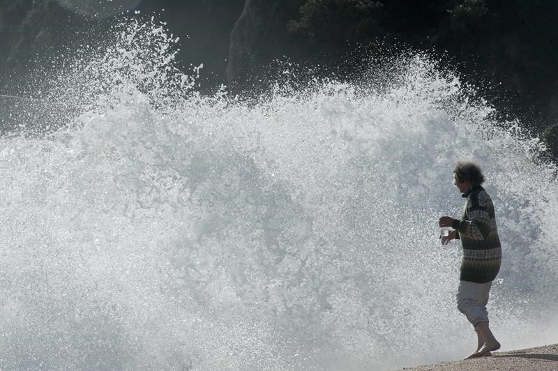 Aspecto de las olas en la playa de Lloret de Mar (Gerona). El temporal de mala mar y las intensas lluvias caídas desde anoche en Cataluña han obligado a los Bomberos de la Generalidad a efectuar hasta este mediodía una veintena de servicios, por temas sin relevancia que no han revestido gravedad, como limpiar calles encharcadas, retirar ramas y sanear fachadas