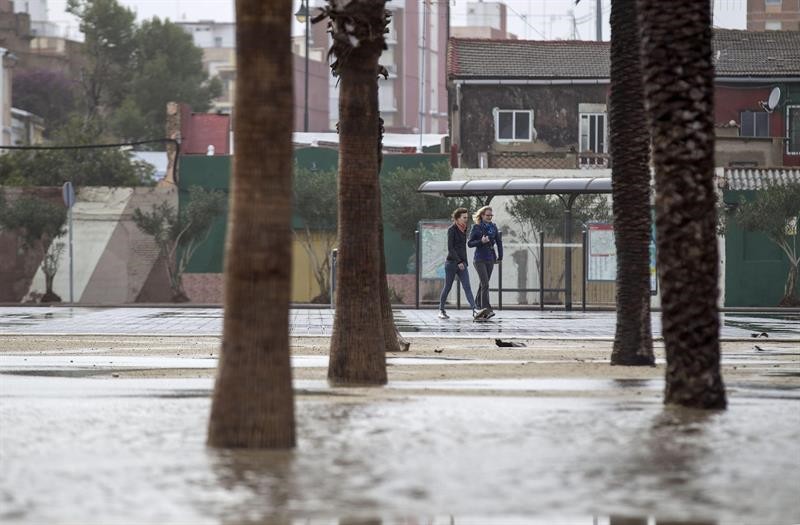 Dos jóvenes se dirigen al paseo marítimo de Valencia a pasear por la playa de Las Arenas de Valencia. El temporal de lluvias que afecta a la Comunitat Valenciana ha descargado precipitaciones de hasta 71 litros por metro cuadrado en Oliva, al sur de la provincia de Valencia, y ha provocado desprendimientos en dos carreteras secundarias de Castellón y Valencia