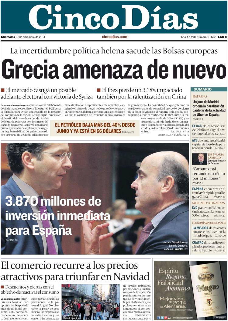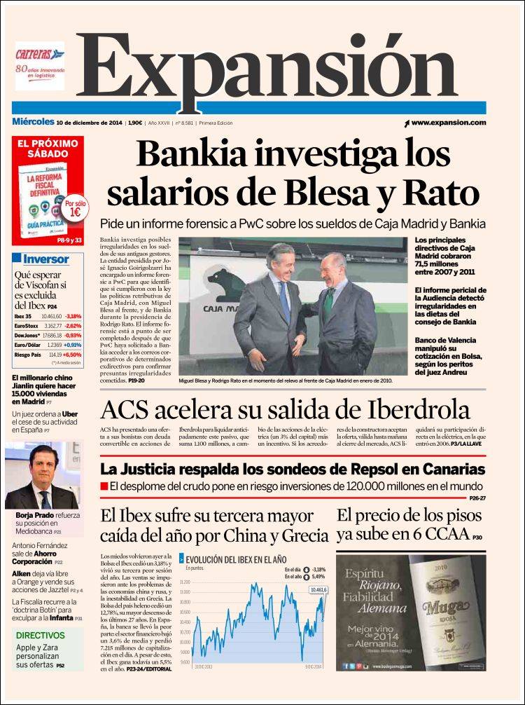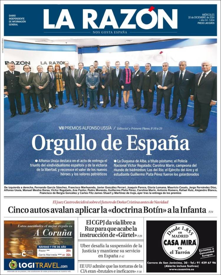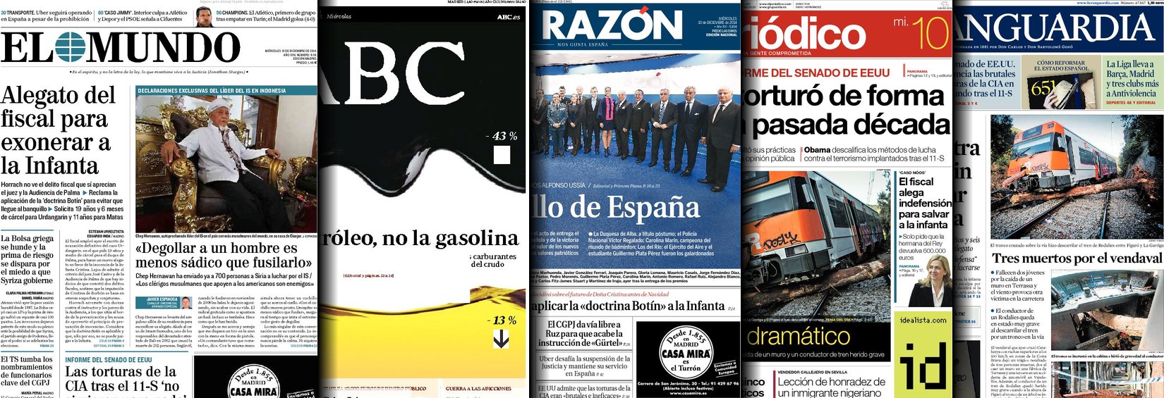 Portadas de los diarios El Mundo, El País, ABC, La Razón, La Vanguardia, El Periódico, Cinco Días, El Economista, Expansión, Marca, As, Mundo Deportivo y Sport.