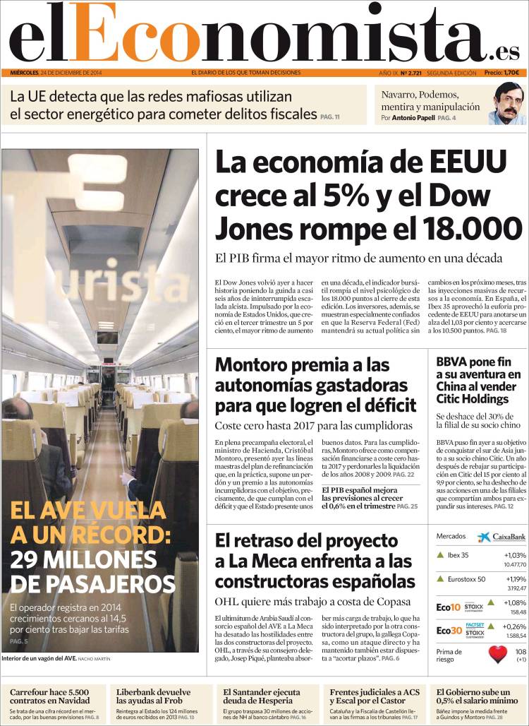 "La economía de EEUU crece al 5% y el Dow Jones rompe el 18.000"