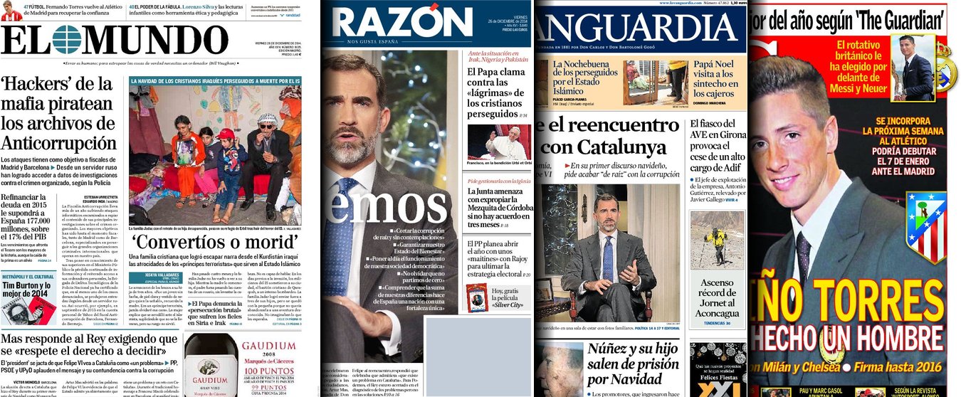 Portadas de los diarios El Mundo, El País, ABC, La Razón, La Vanguardia, El Periódico, El Economista, Expansión, Marca, As, Mundo Deportivo y Sport.