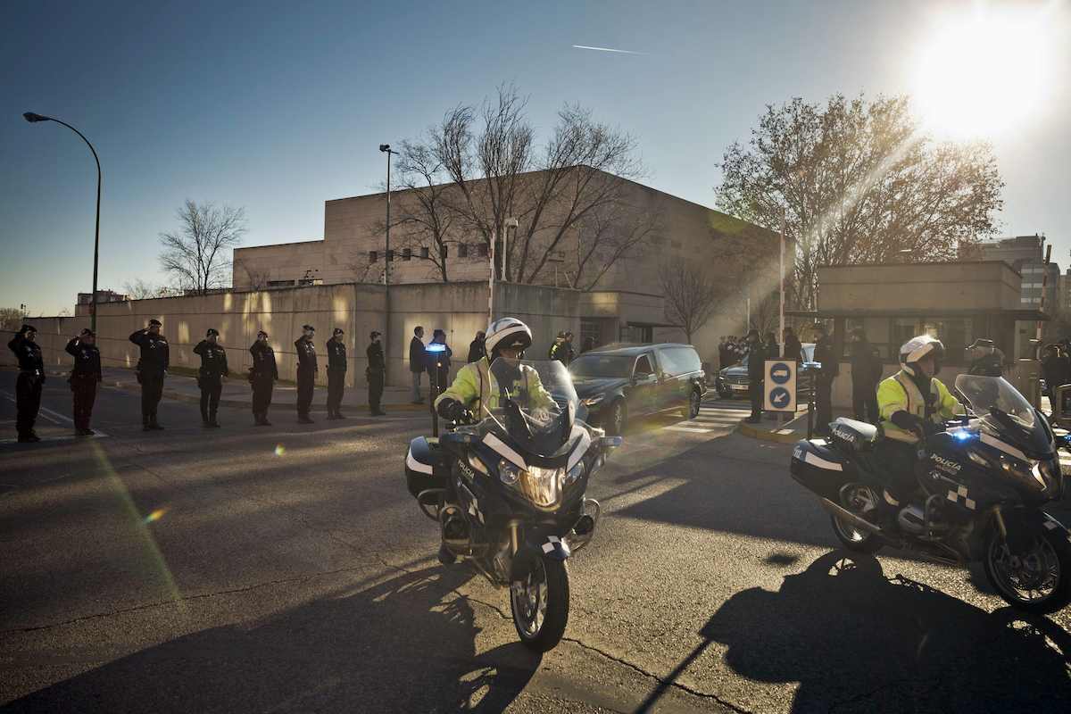 Momento en el que el vehículo con el féretro del agente fallecido llegaba a las instalaciones del Complejo Policial de Canillas, en Madrid.