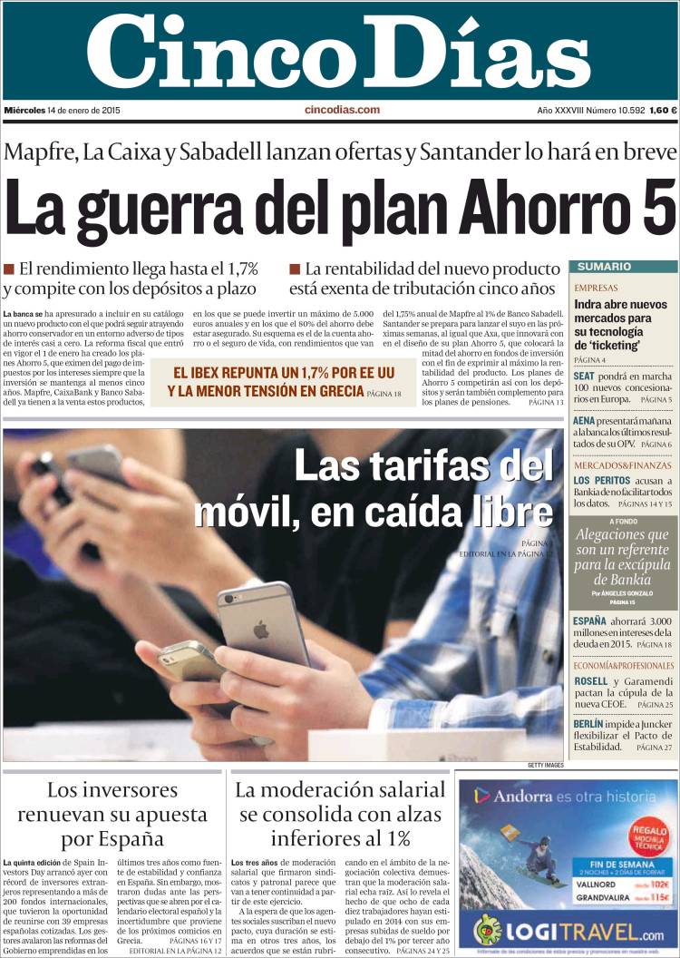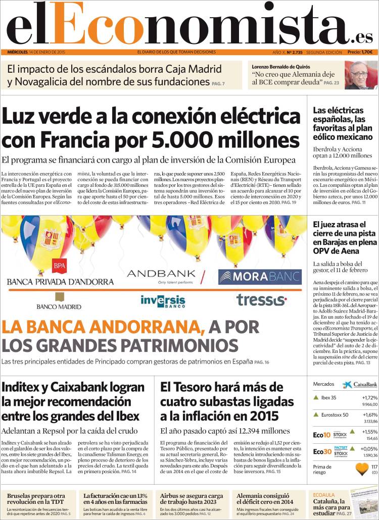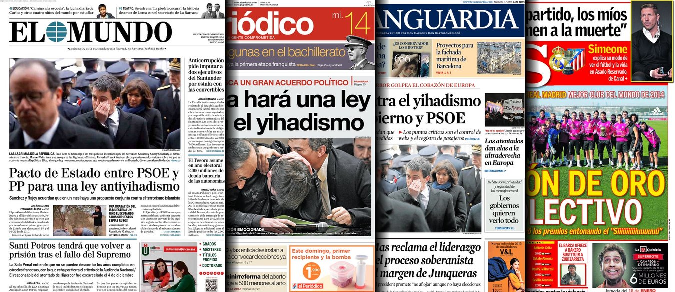 Portadas de los diarios El Mundo, El País, ABC, La Razón, La Vanguardia, El Periódico, Cinco Días, El Economista, Expansión, Marca, As, Mundo Deportivo y Sport.