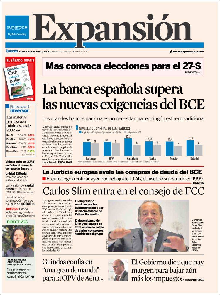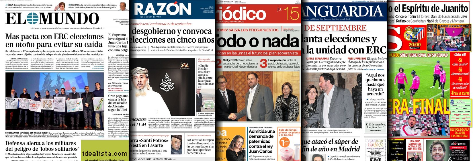 Portadas de los diarios El Mundo, El País, ABC, La Razón, La Vanguardia, El Periódico, Cinco Días, El Economista, Expansión, Marca, As, Mundo Deportivo y Sport.
