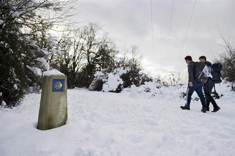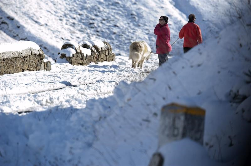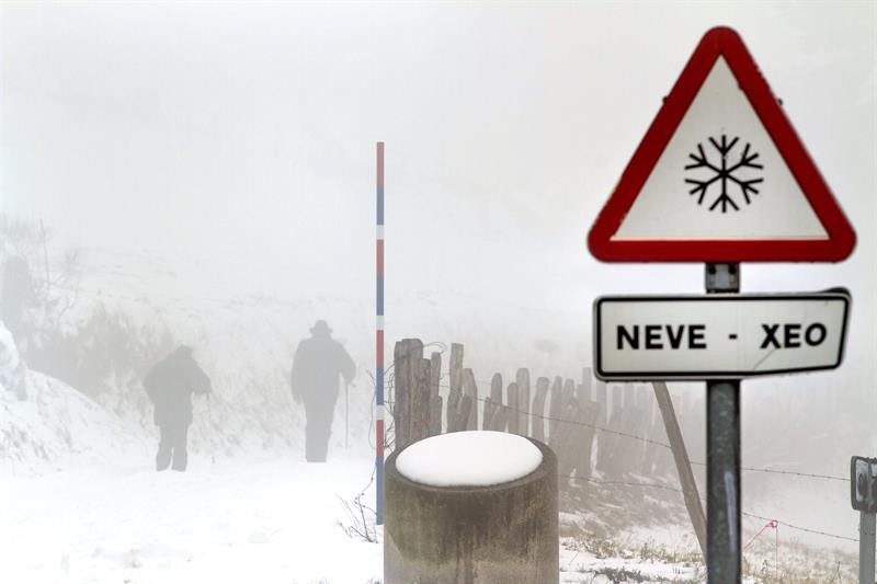 Dos personas suben a pie al albergue de los Ancares y Tres Obispos en Lugo que permanecía este domingo cubierto de nieve debido al temporal de frío que afecta a Galicia y gran parte de la península.