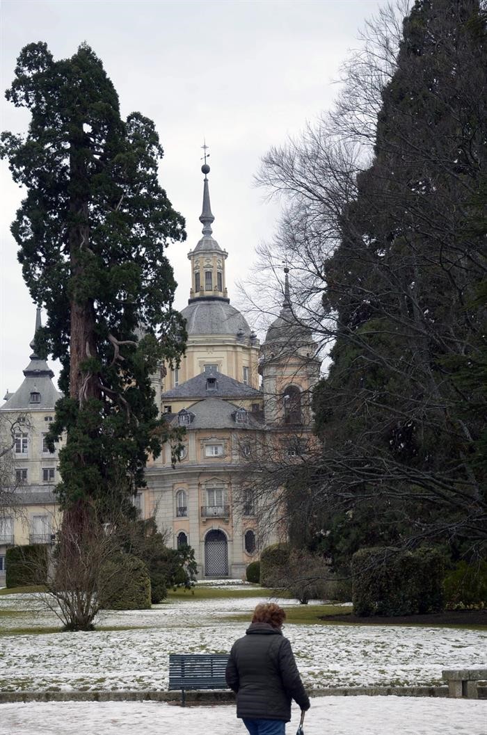 Una mujer en los jardines del Palacio Real de La Granja de San Ildefonso que se encuentran cubiertos por la nieve caída en las últimas horas.