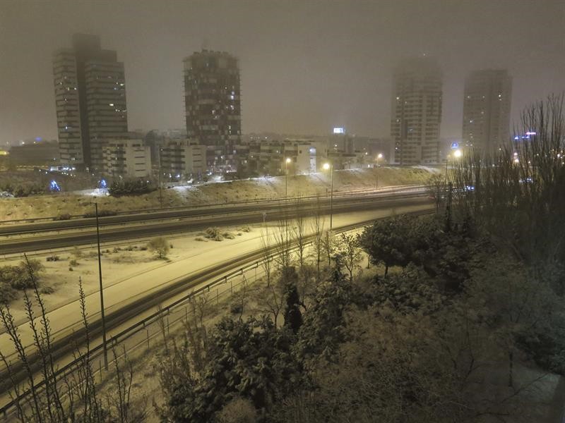 Aspecto del madrileño Nudo de Manoteras, tras la nevada caída esta noche en la capital de España.
