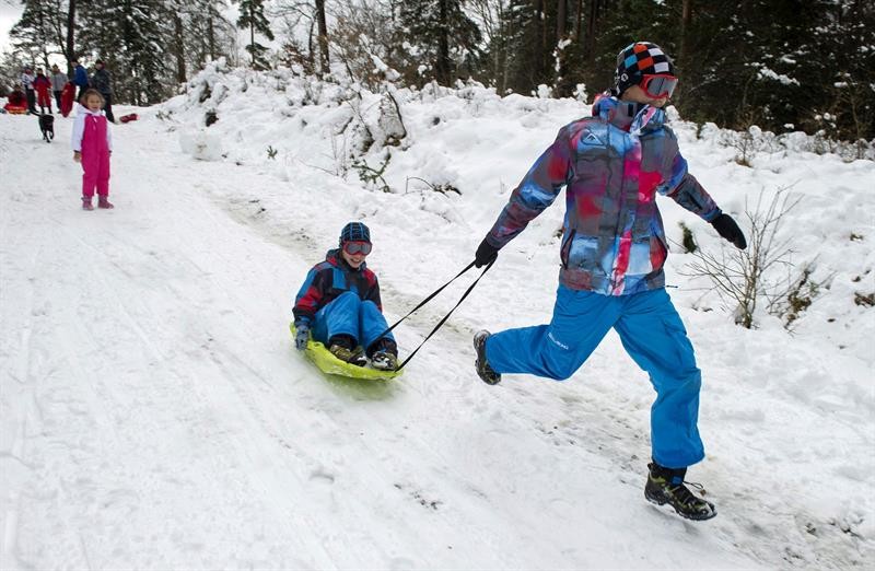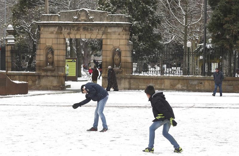 Varios niños juegan con la nieve caída en Soria. Toda Castilla y León en alerta por nevadas, como es el caso de Soria, León, Ávila y algún barrio de Valladolid.