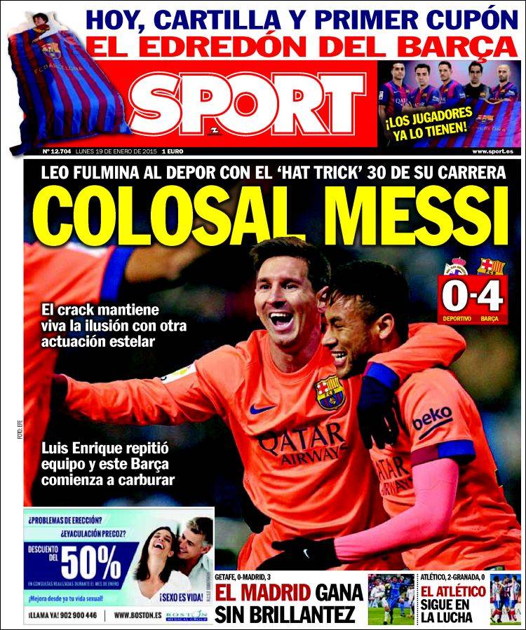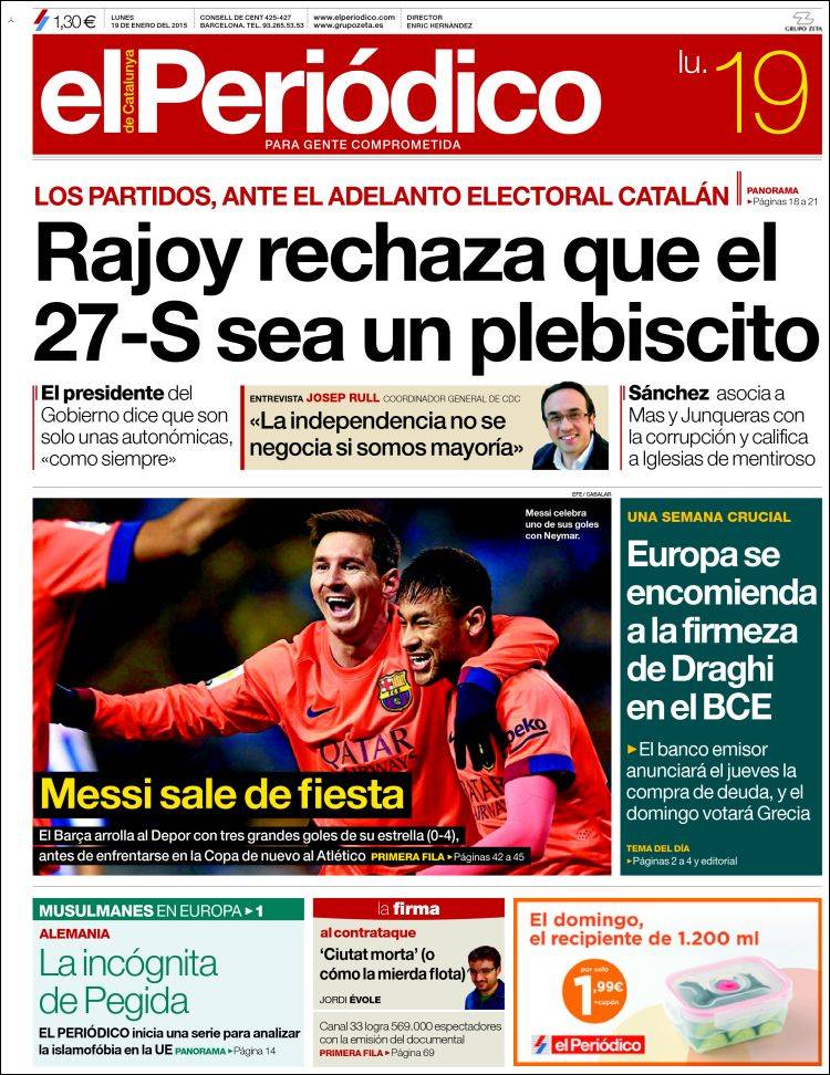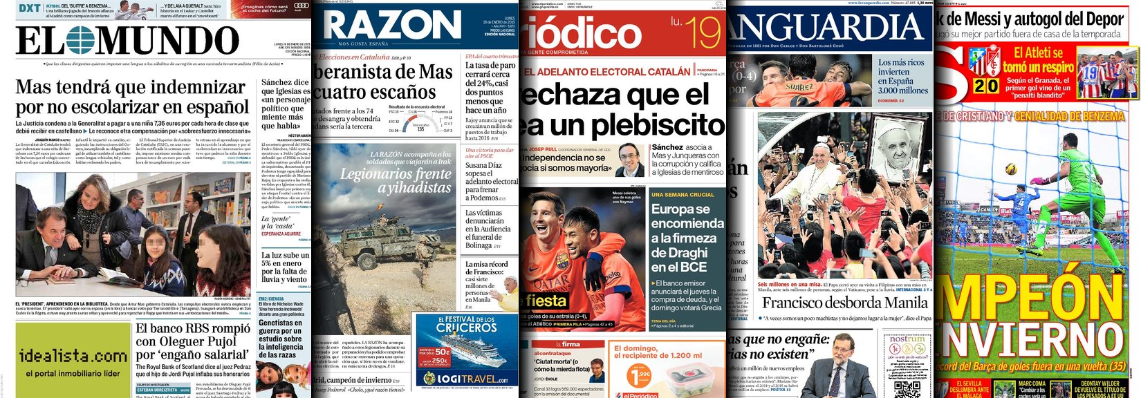 Portadas de los diarios El Mundo, El País, ABC, La Razón, La Vanguardia, El Periódico, Cinco Días, El Economista, Expansión, Marca, As, Mundo Deportivo y Sport.