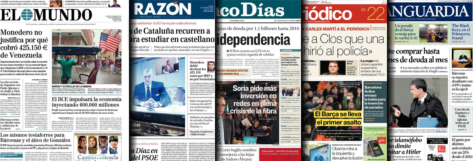 Portadas de los diarios El Mundo, El País, ABC, La Razón, La Vanguardia, El Periódico, Cinco Días, El Economista, Expansión, Marca, As, Mundo Deportivo y Sport.