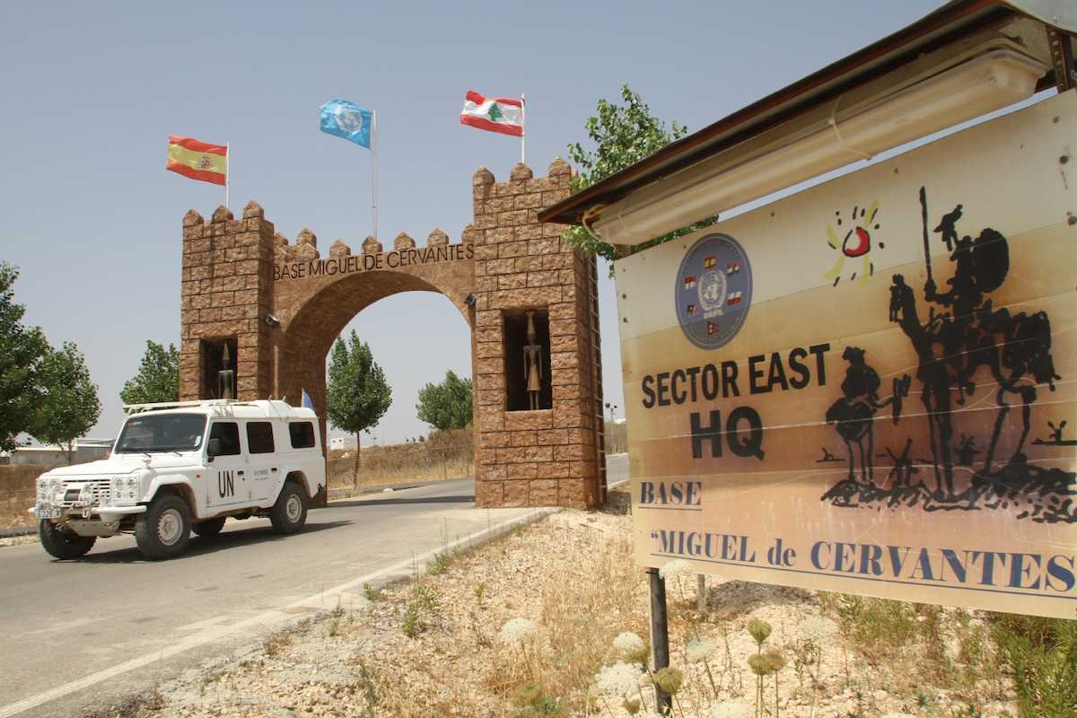 Cascos azules españoles en la puerta de la base Miguel de Cervantes en Marjayoun.