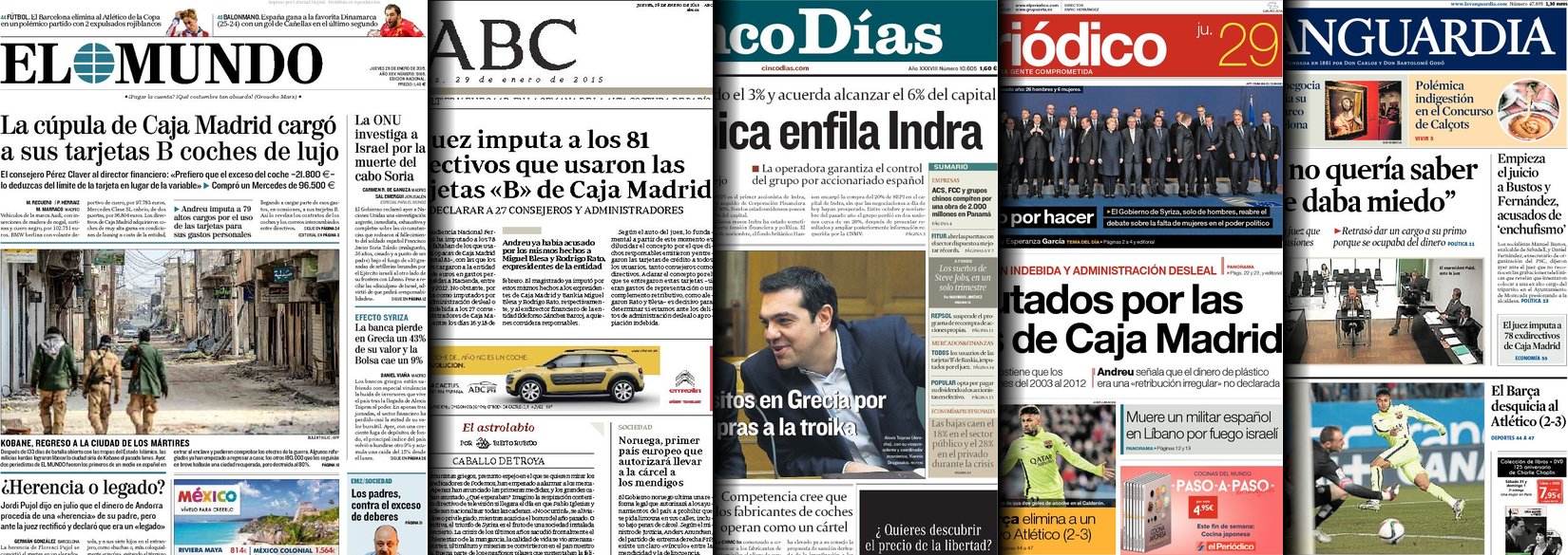 Portadas de los diarios El Mundo, El País, ABC, La Razón, La Vanguardia, El Periódico, Cinco Días, El Economista, Expansión, Marca, As, Mundo Deportivo y Sport.