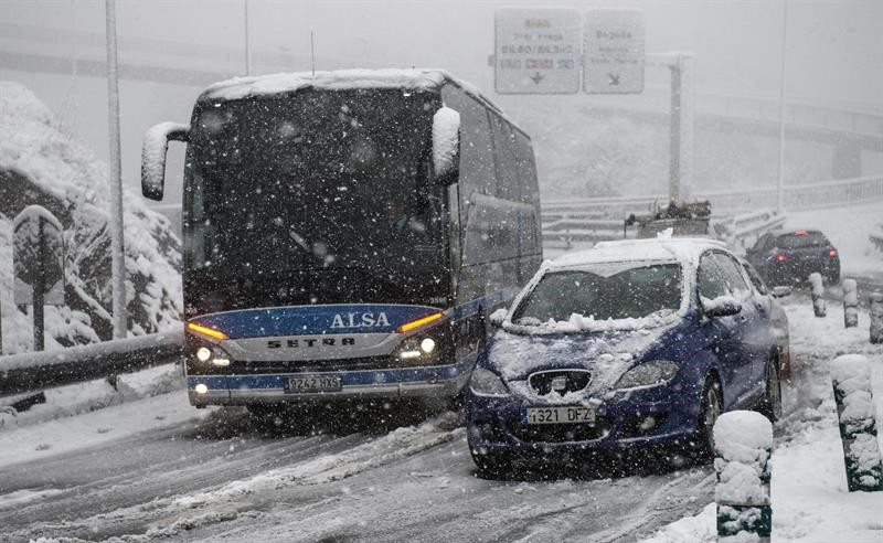 Autobuses y turismos permanecen atrapados por la nieve y el hielo en la subida a Artxanda en Bilbao