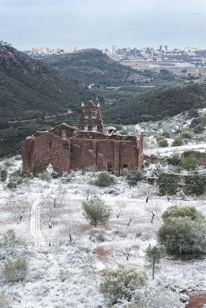 Carretera C-37 que atraviesa la localidad de Santa Margarida de Montbui, en Barcelona. Siete carreteras de la red viaria catalana han sido cortadas por culpa de la nieve.