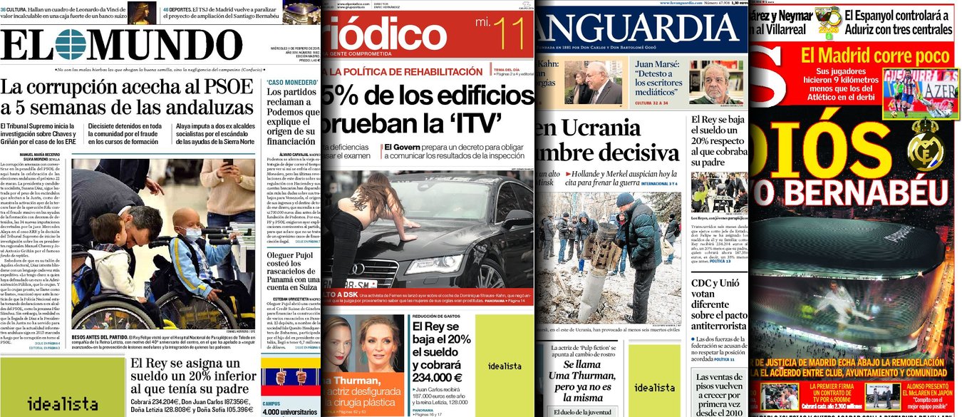 Portadas de los diarios El Mundo, El País, ABC, La Razón, La Vanguardia, El Periódico, Cinco Días, El Economista, Expansión, Marca, As, Mundo Deportivo y Sport.