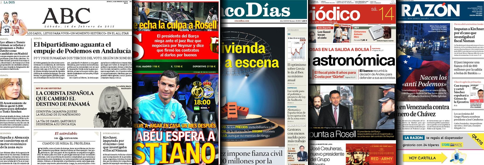 Portadas de los diarios ABC, La Razón, As, Cinco Días, El Periódico y La Vanguardia.