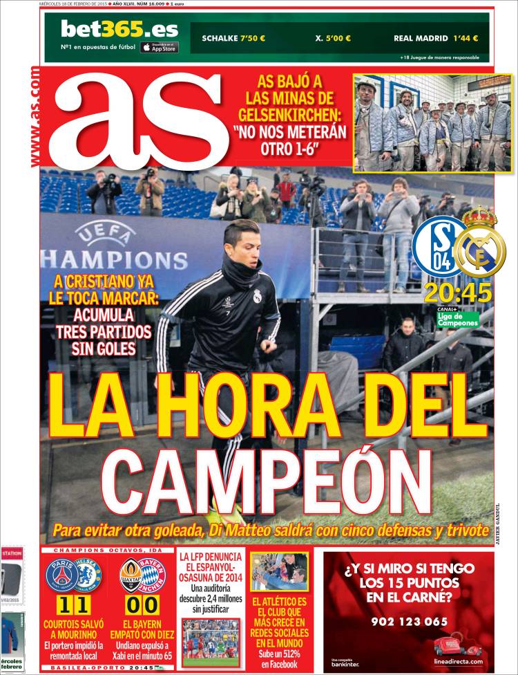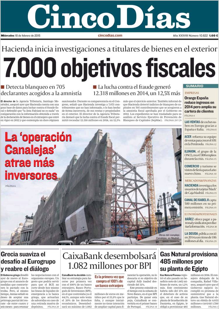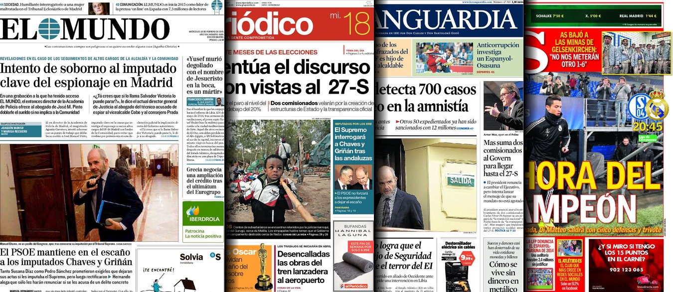 Portadas de los diarios El Mundo, El País, ABC, La Razón, La Vanguardia, El Periódico, Cinco Días, El Economista, Expansión, Marca, As, Mundo Deportivo y Sport.