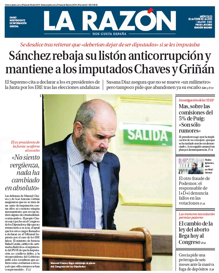 "Sánchez rebaja su listón anticorrupción y mantiene a los imputados Chaves y Griñán"