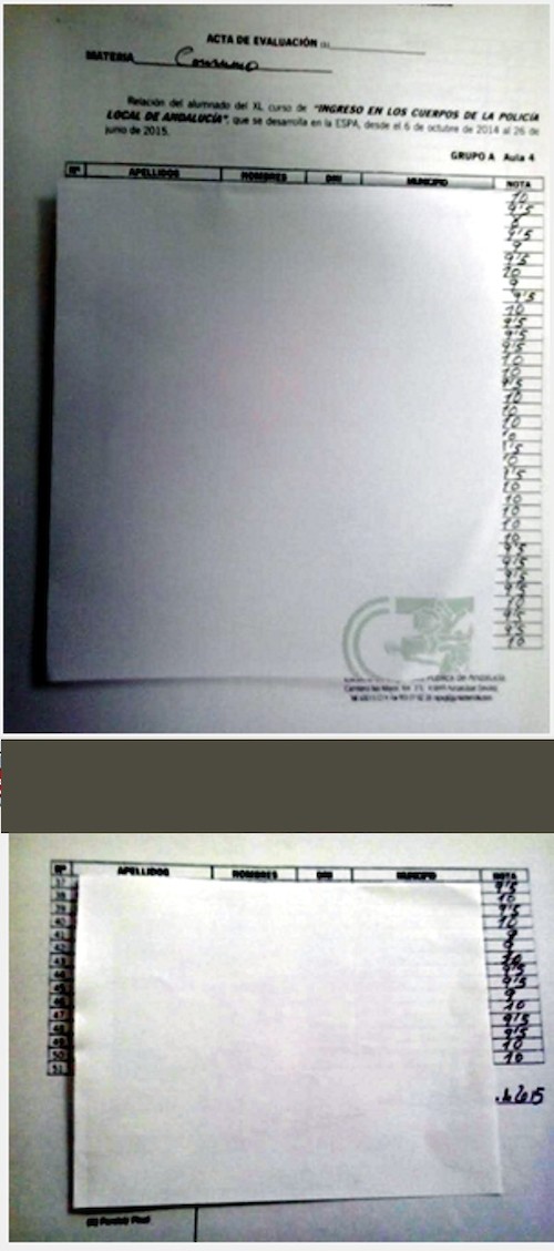 Curiosamente, desde que el jefe del servicio decidió no cumplir la normativa aprobada por el consejero y consiguió tener en sus manos las preguntas de los exámenes antes de ser realizados en la asignatura Policía Administrativa del curso de Ingreso en los Cuerpos de la Policía Local, la más importante de dicho curso atendiendo a su carga lectiva, los dos últimos exámenes efectuados han arrojado resultados sorprendentes. En uno de ellos, el 98% del alumnado ha obtenido calificación de sobresaliente o matrícula de honor, y el resto, el 2 por ciento, un notable; en el otro examen, el 92% ha obtenido matrícula o sobresaliente, y el resto, el 8 por ciento, notable.
