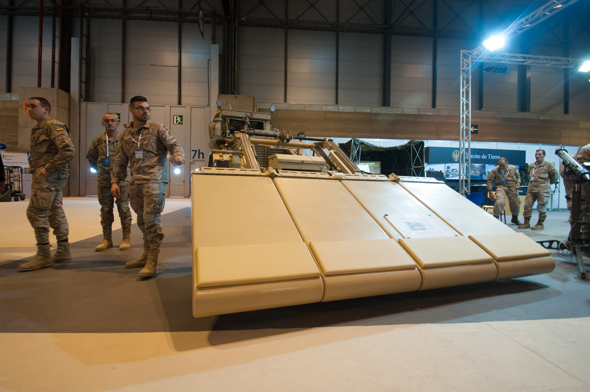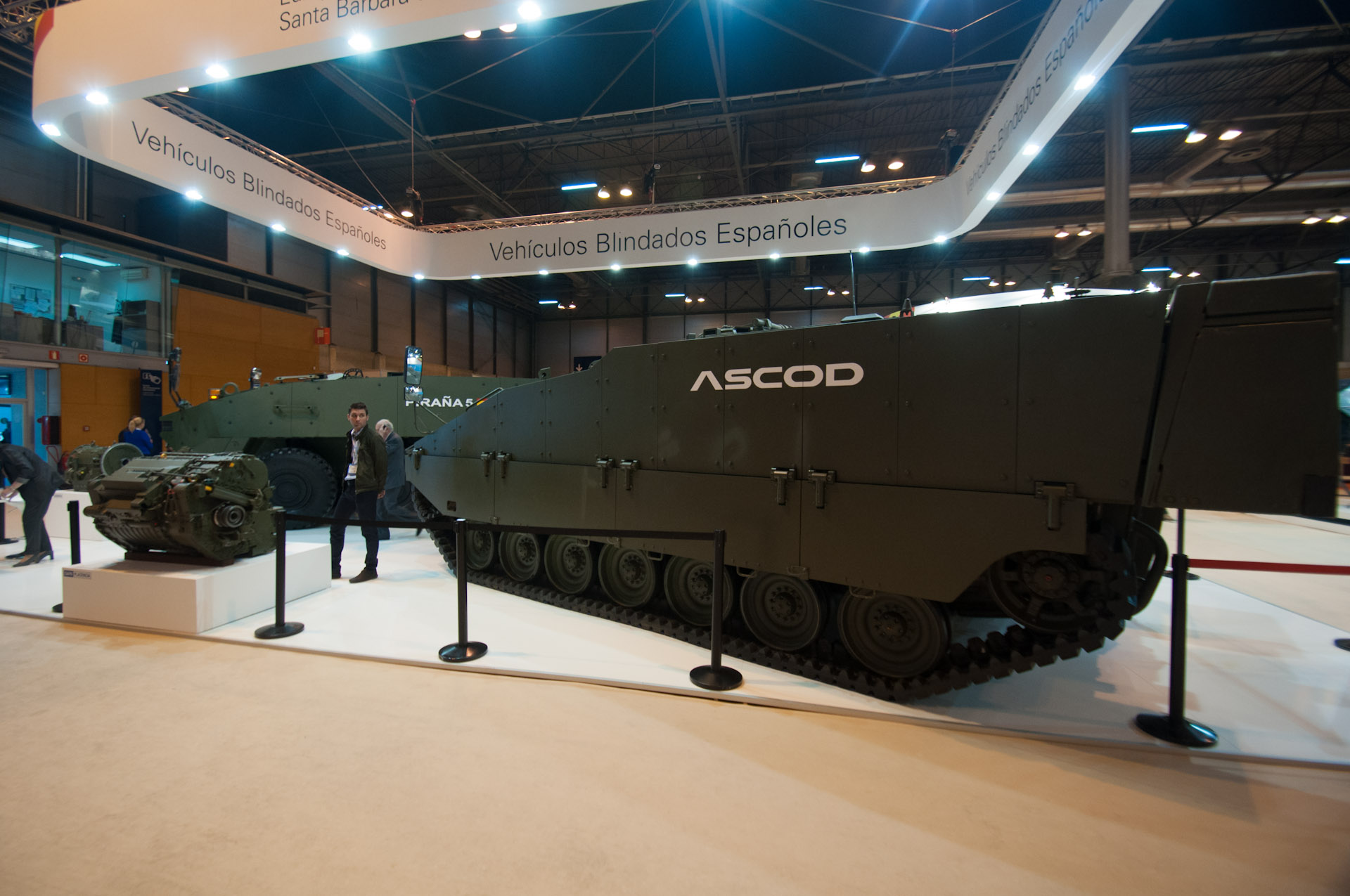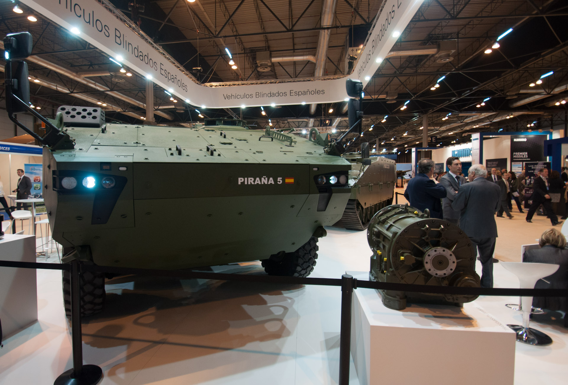 Un detalle del vehículo español Piraña 5 y su motor a la derecha.