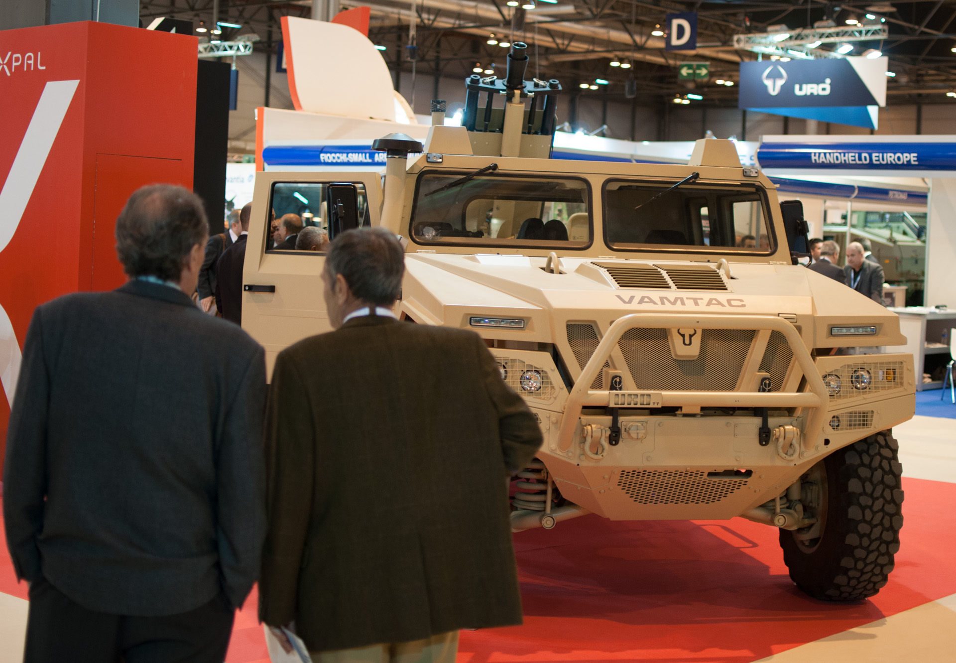 Dos hombres observan un vehículo VAMTAC S-T5 de la empresa URO.