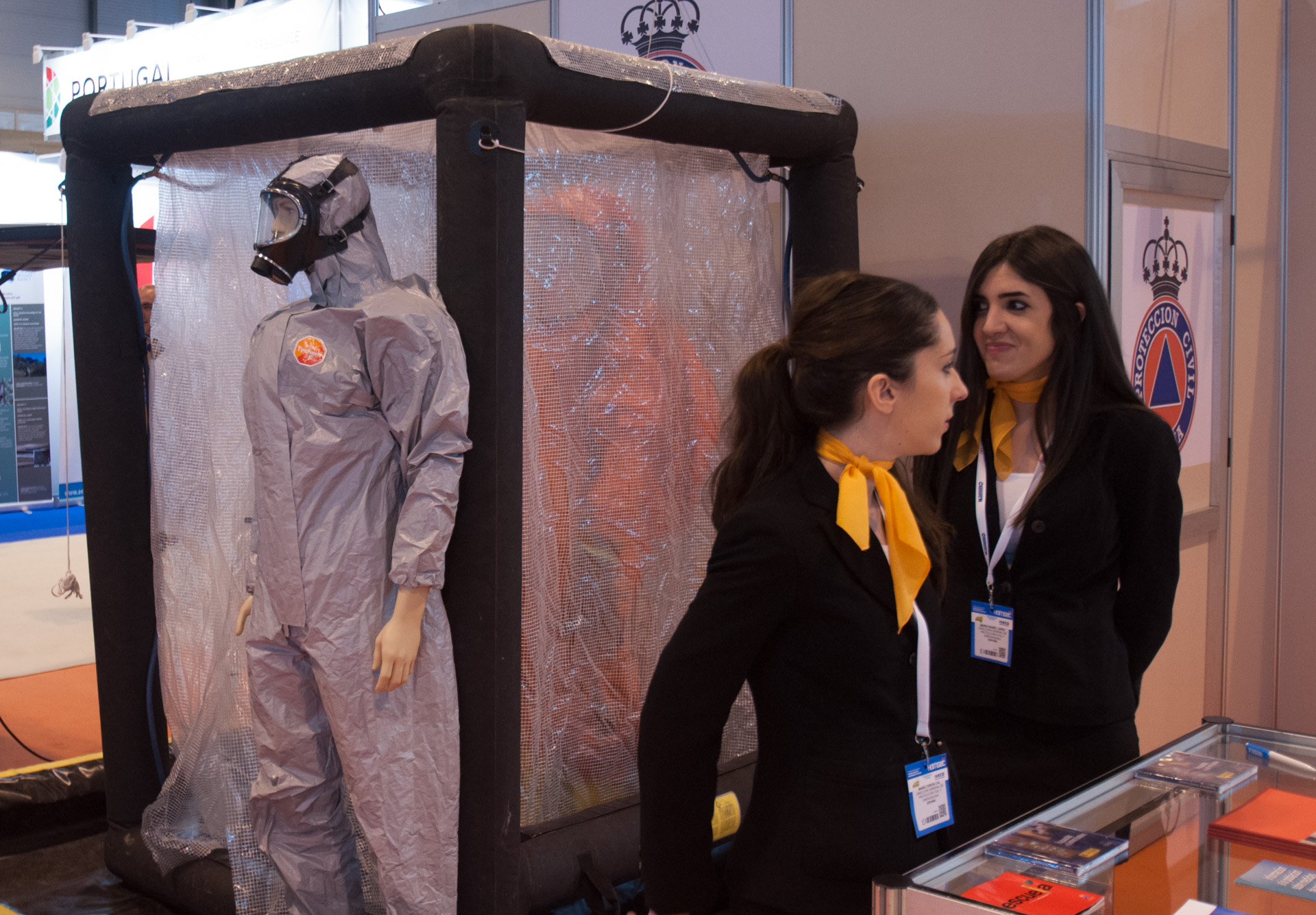 Dos azafatas observan desde su stand dedicado a Protección Civil.
