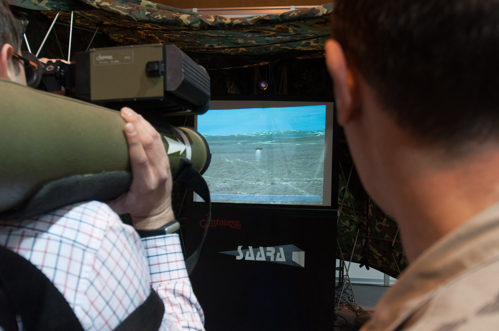 Probamos el lanzamisiles Alcotan 100 con la ayuda de un oficial de Ejército de Tierra. En la pantalla del simulador se puede ver cómo el misil disparado se acerca a su objetivo. El resultado final fue muy satisfactorio, pero no perfecto, según el instructor.